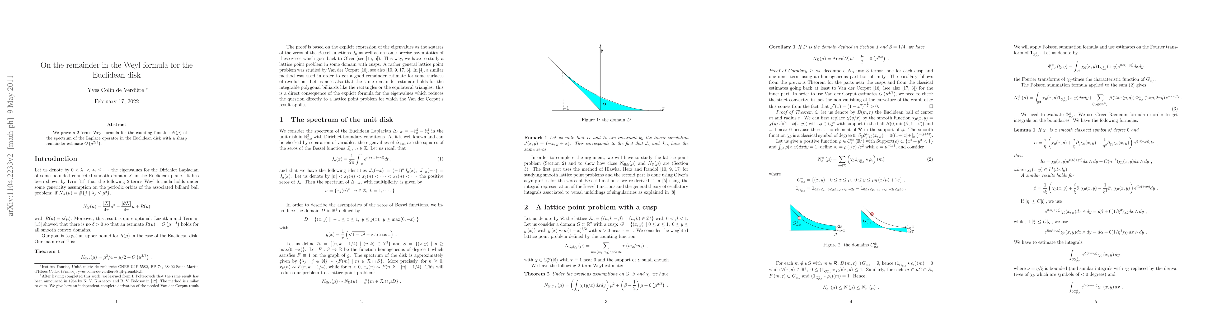 Summary: This paper establishes a precise 2-term Weyl formula for the spectrum of the Laplace operator in a Euclidean disk, providing a sharp remainder estimate of O(μ^2/3). The results enhance the understanding of the distribution of eigenvalues in such geometric settings.