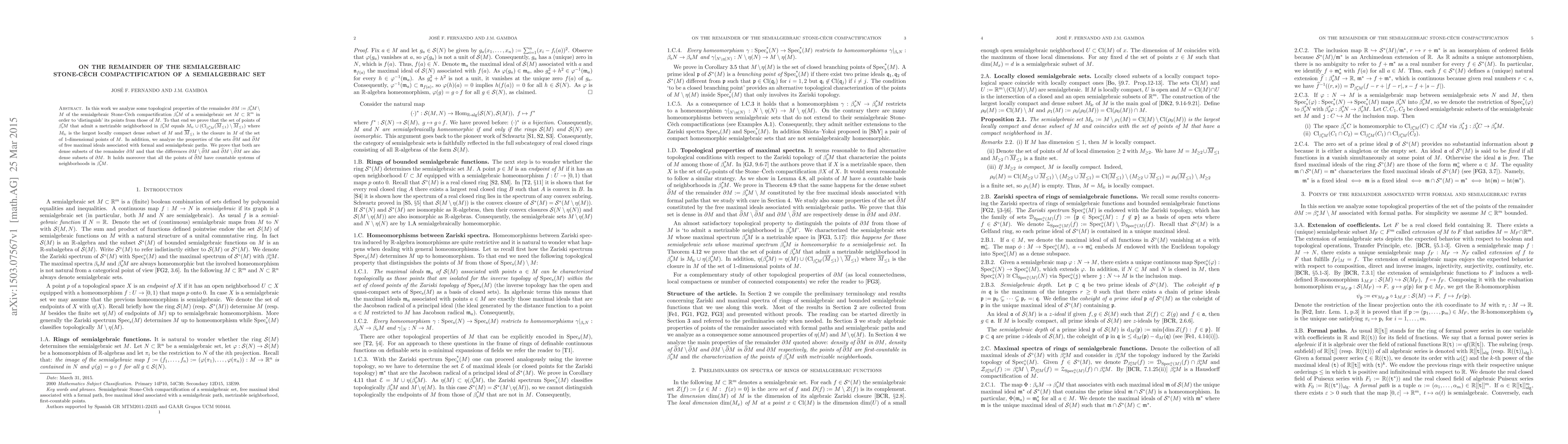 In this work we analyze some topological properties of the remainder $\partial M:=\beta_s^* M\setminus M$ of the semialgebraic Stone-C\v{e}ch compactification $\beta_s^* M$ of a semialgebraic set $M\subset{\mathbb R}^m$ in order to `distinguish' its points from those of $M$. To that end we prove that the set of points of $\beta_s^* M$ that admit a metrizable neighborhood in $\beta_s^* M$ equals $M_{\rm lc}\cup( {\rm Cl}_{\beta_s^* M}(\overline{M}_{\leq1})\setminus\overline{M}_{\leq1})$ where $M_{\rm lc}$ is the largest locally compact dense subset of $M$ and $\overline{M}_{\leq1}$ is the closure in $M$ of the set of $1$-dimensional points of $M$. In addition, we analyze the properties of the sets $\widehat{\partial}M$ and $\widetilde{\partial}M$ of free maximal ideals associated with formal and semialgebraic paths. We prove that both are dense subsets of the remainder $\partial M$ and that the differences $\partial M\setminus\widehat{\partial}M$ and $\widehat{\partial} M\setminus\widetilde{\partial}M$ are also dense subsets of $\partial M$. It holds moreover that all the points of $\widehat{\partial}M$ have countable systems of neighborhoods in $\beta_s^* M$.