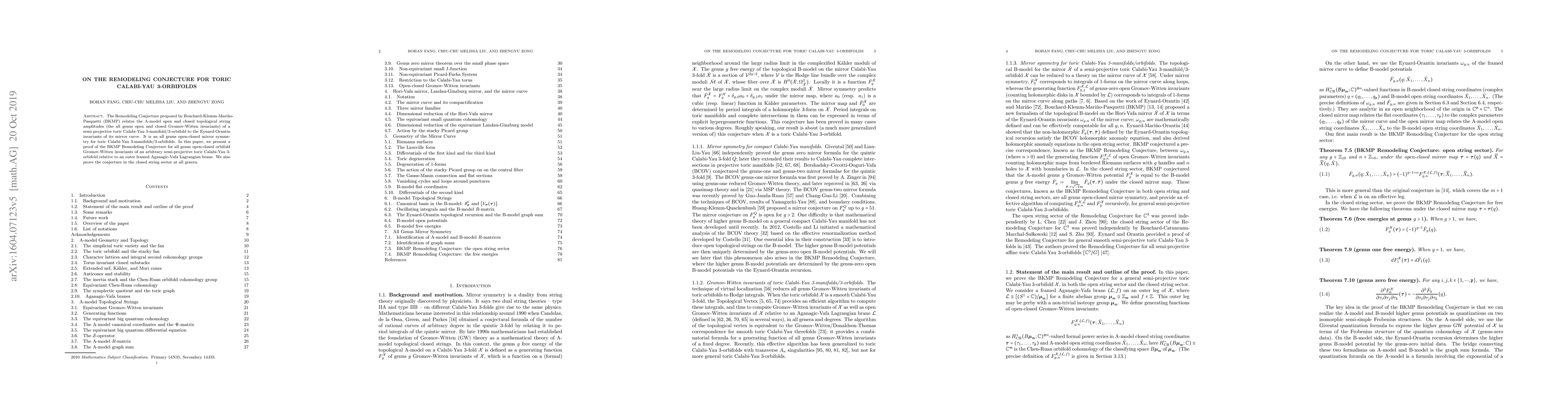 This paper presents a proof of the Remodeling Conjecture for toric Calabi-Yau 3-orbifolds, demonstrating the equivalence between open-closed Gromov-Witten invariants and the Eynard-Orantin invariants of their mirror curves, thus establishing an all-genus open-closed mirror symmetry.