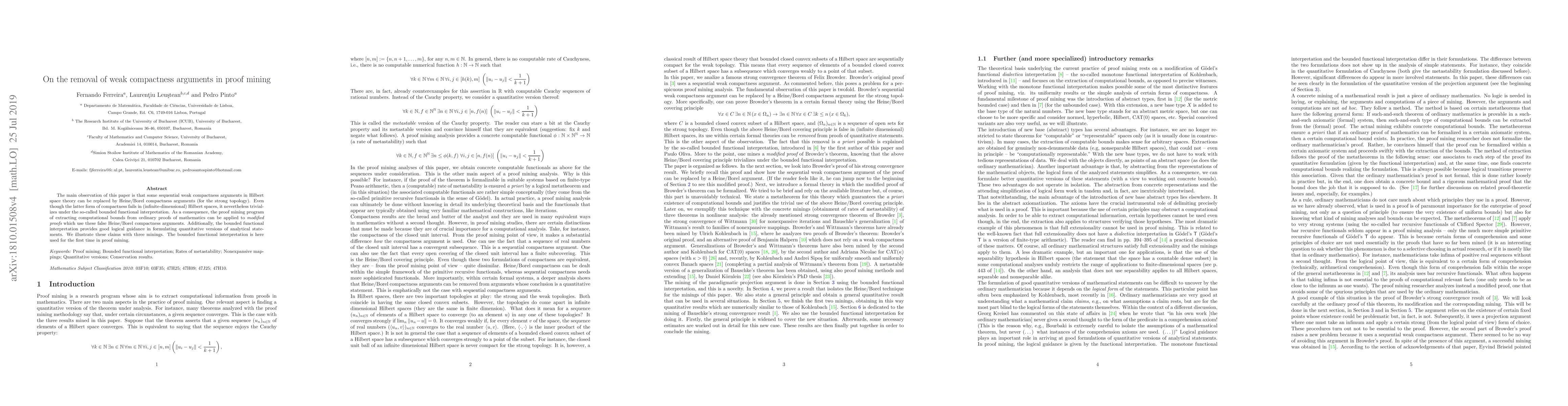 The main observation of this paper is that some sequential weak compactness arguments in Hilbert space theory can be replaced by Heine/Borel compactness arguments (for the strong topology). Even though the latter form of compactness fails in (infinite-dimensional) Hilbert spaces, it nevertheless trivializes under the so-called bounded functional interpretation. As a consequence, the proof mining programme of extracting computational bounds from ordinary proofs of mathematics can be applied to {\em modified proofs} which use these false Heine/Borel compactness arguments. Additionally, the bounded functional interpretation provides good logical guidance in formulating quantitative versions of analytical statements. We illustrate these claims with three minings. The bounded functional interpretation is here used for the first time in proof mining.
