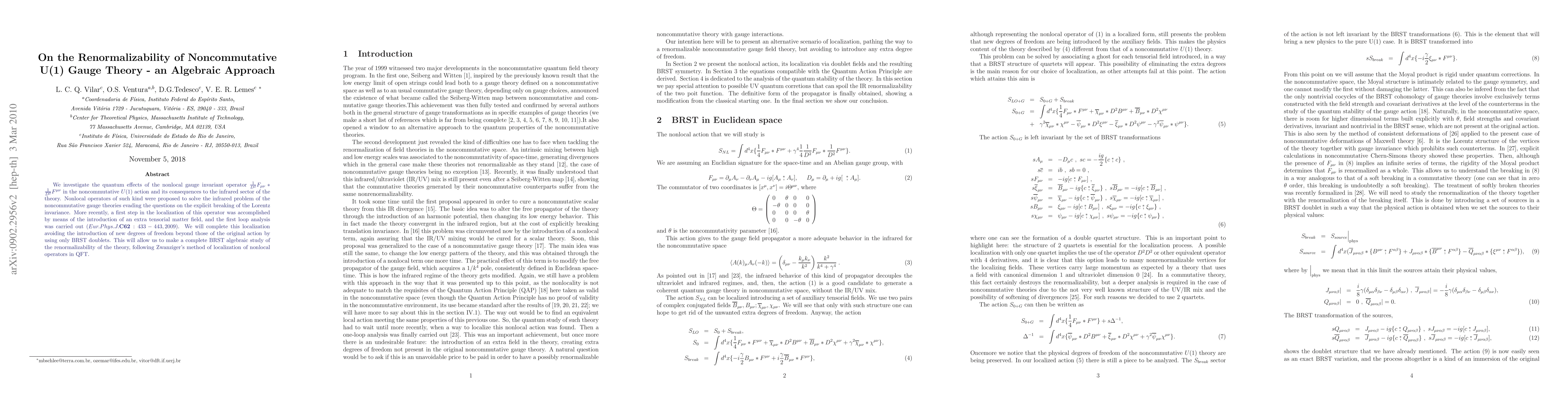 We investigate the quantum effects of the nonlocal gauge invariant operator $\frac{1}{{}{D}^{2}}{F}_{\mu \nu}\ast \frac{1}{{}{D}^{2}}{F}^{\mu \nu}$ in the noncommutative U(1) action and its consequences to the infrared sector of the theory. Nonlocal operators of such kind were proposed to solve the infrared problem of the noncommutative gauge theories evading the questions on the explicit breaking of the Lorentz invariance. More recently, a first step in the localization of this operator was accomplished by means of the introduction of an extra tensorial matter field, and the first loop analysis was carried out $(Eur.Phys.J.\textbf{C62}:433-443,2009)$. We will complete this localization avoiding the introduction of new degrees of freedom beyond those of the original action by using only BRST doublets. This will allow us to make a complete BRST algebraic study of the renormalizability of the theory, following Zwanziger's method of localization of nonlocal operators in QFT.