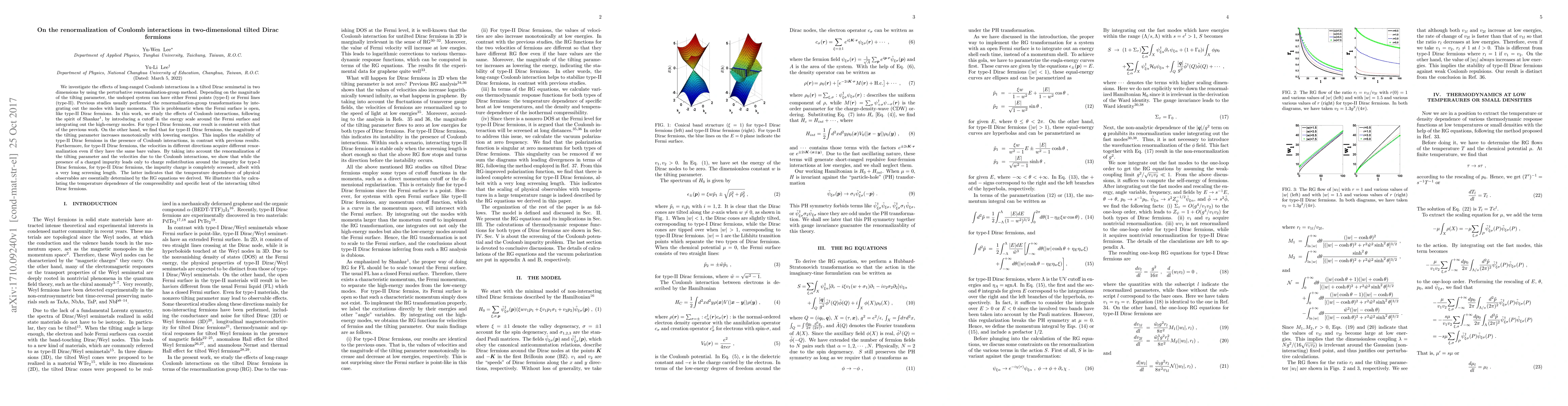 This paper examines the renormalization of Coulomb interactions in two-dimensional tilted Dirac fermions using a perturbative renormalization-group method, finding that type-II Dirac fermions exhibit stability and unique screening behavior under Coulomb interactions, unlike type-I fermions, which only redistribute charge around impurities.