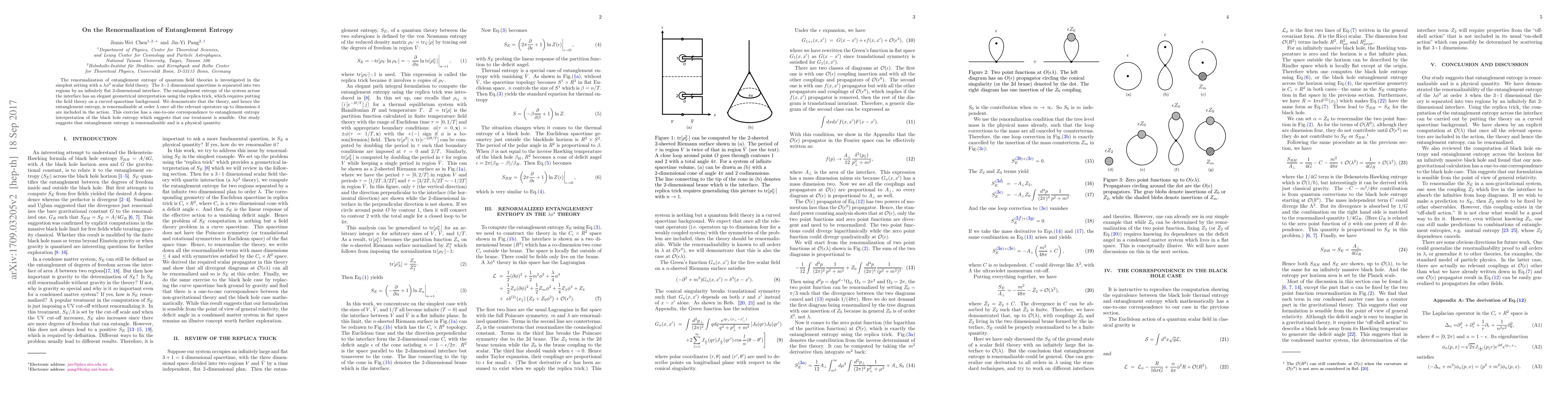 This paper explores the renormalization of entanglement entropy in a $lambda phi^4$ scalar field theory using a flat 2D interface in 3+1D spacetime. It shows the theory is renormalizable at order $lambda$ when dimension-4 operators are included, suggesting entanglement entropy as a physical, renormalizable quantity with implications for black hole entropy interpretation.