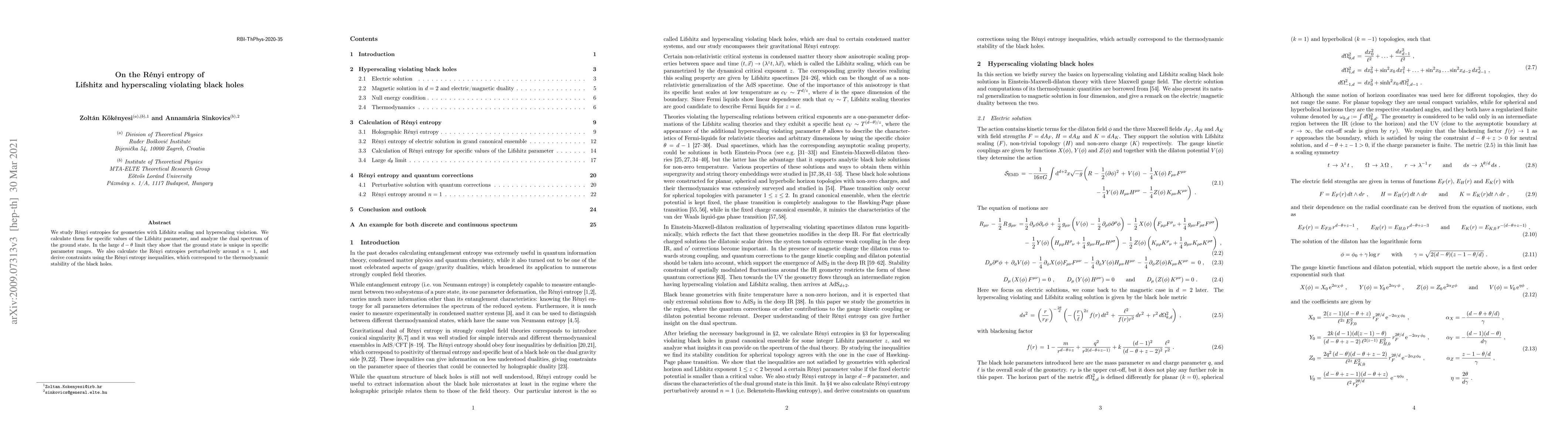 We study R\'enyi entropies for geometries with Lifshitz scaling and hyperscaling violation. We calculate them for specific values of the Lifshitz parameter, and analyze the dual spectrum of the ground state. In the large $d-\theta$ limit they show that the ground state is unique in specific parameter ranges. We also calculate the R\'enyi entropies perturbatively around $n=1$, and derive constraints using the R\'enyi entropy inequalities, which correspond to the thermodynamic stability of the black holes.