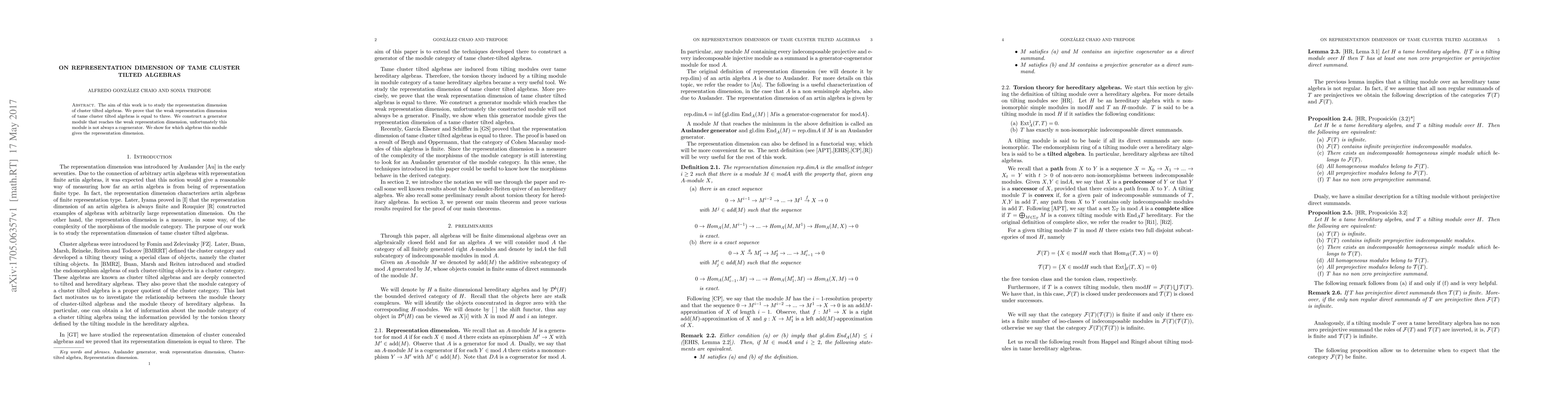 This paper investigates the representation dimension of tame cluster tilted algebras, proving that their weak representation dimension is three. It constructs a generator module achieving this dimension but notes it is not always a cogenerator, and identifies specific cases where it does provide the full representation dimension.