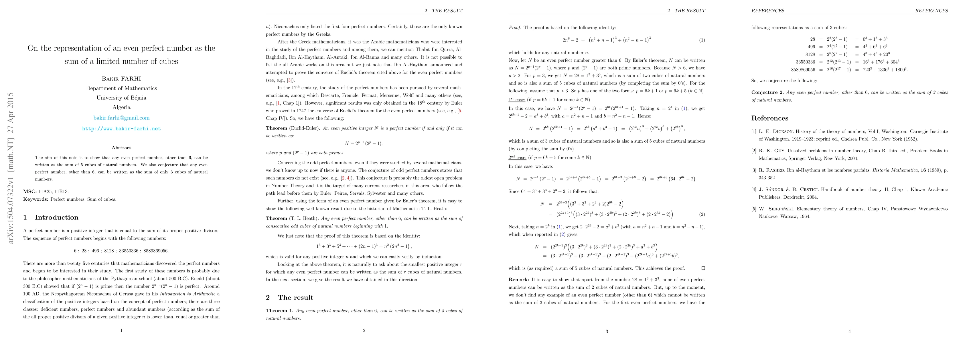 The aim of this note is to show that any even perfect number, other than $6$, can be written as the sum of 5 cubes of natural numbers. We also conjecture that any even perfect number, other than $6$, can be written as the sum of only 3 cubes of natural numbers.