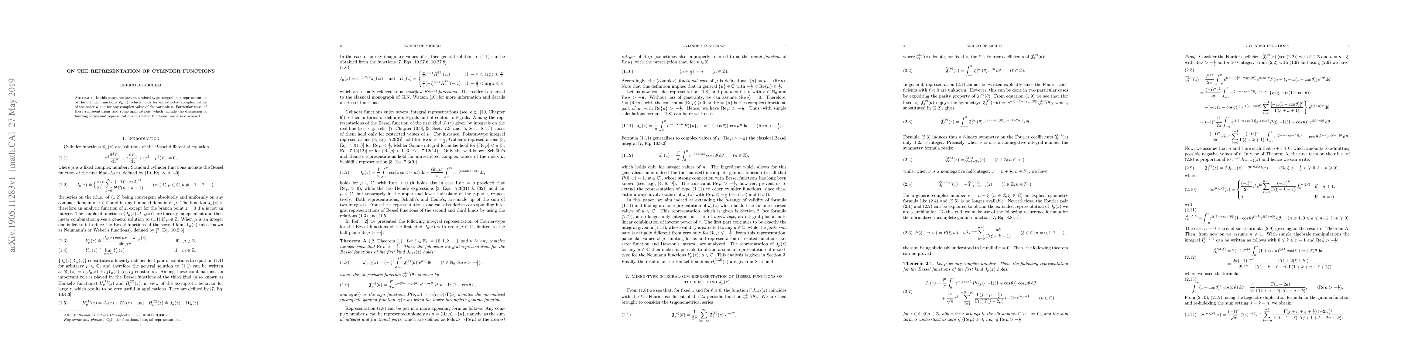 In this paper, we present a mixed-type integral-sum representation of the cylinder functions $\mathscr{C}_\mu(z)$, which holds for unrestricted complex values of the order $\mu$ and for any complex value of the variable $z$. Particular cases of these representations and some applications, which include the discussion of limiting forms and representations of related functions, are also discussed.