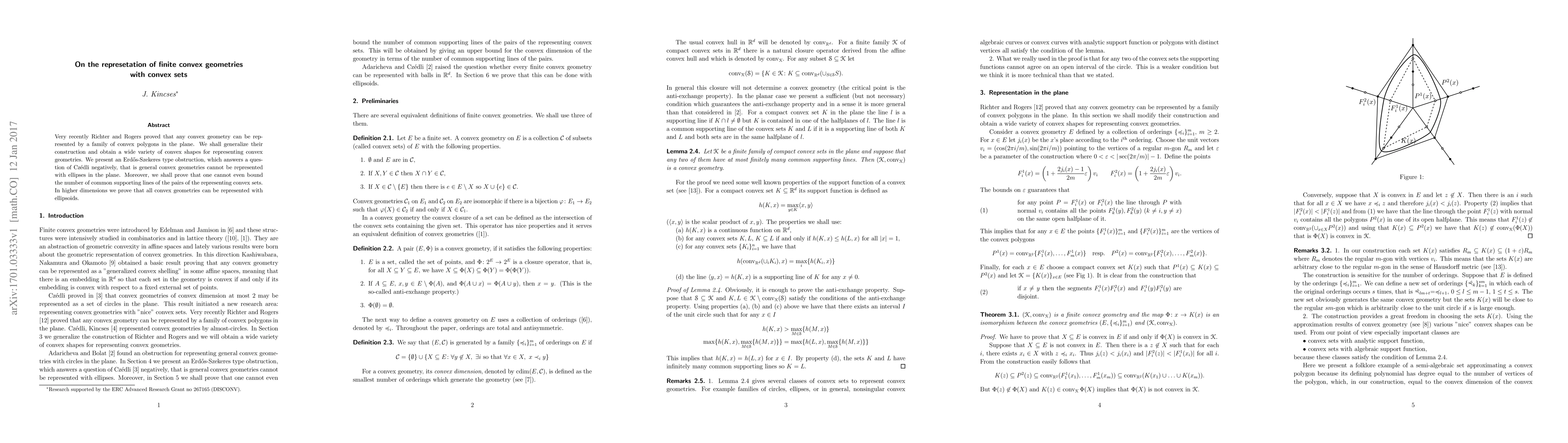 This paper generalizes the representation of convex geometries by convex sets, showing that various shapes beyond polygons can represent these geometries. It disproves the possibility of representing all convex geometries using ellipses and proves that no bound exists for the number of common supporting lines between pairs of representing convex sets. In higher dimensions, it confirms that all convex geometries can be represented using ellipsoids.