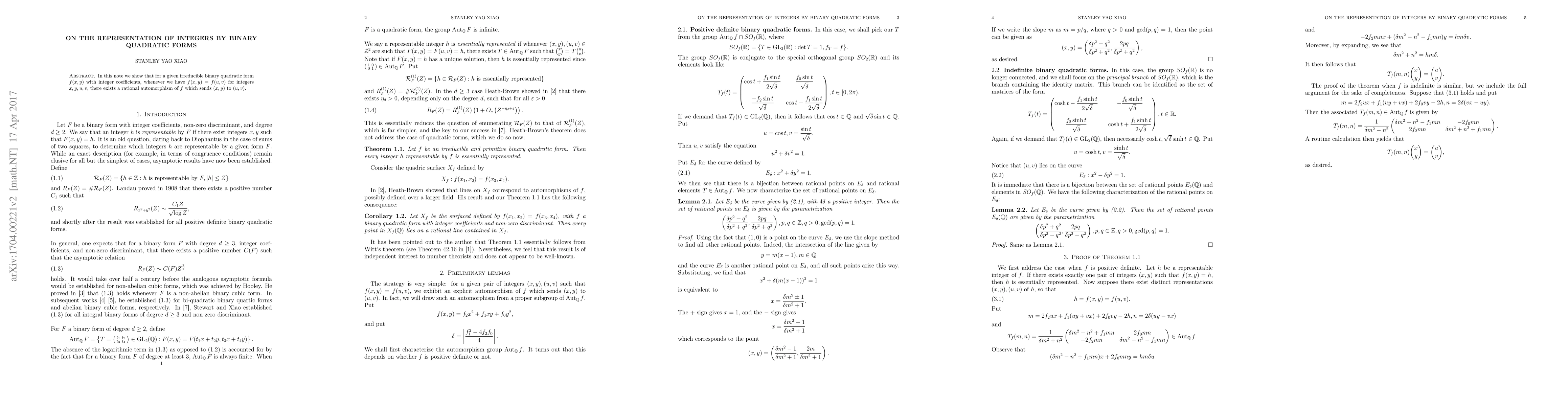 In this note we show that for a given irreducible binary quadratic form $f(x,y)$ with integer coefficients, whenever we have $f(x,y) = f(u,v)$ for integers $x,y,u,v$, there exists a rational automorphism of $f$ which sends $(x,y)$ to $(u,v)$.