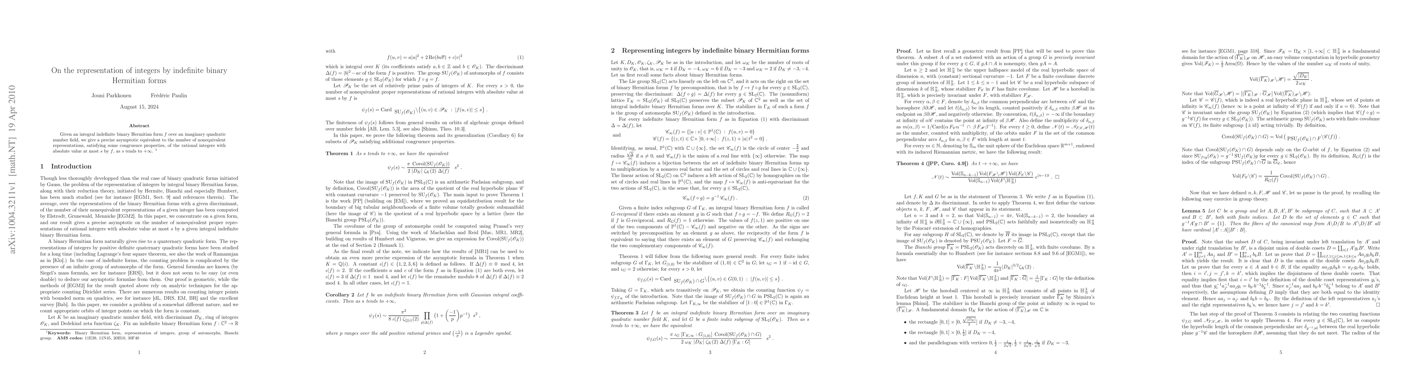 Given an integral indefinite binary Hermitian form f over an imaginary quadratic number field, we give a precise asymptotic equivalent to the number of nonequivalent representations, satisfying some congruence properties, of the rational integers with absolute value at most s by f, as s tends to infinity.