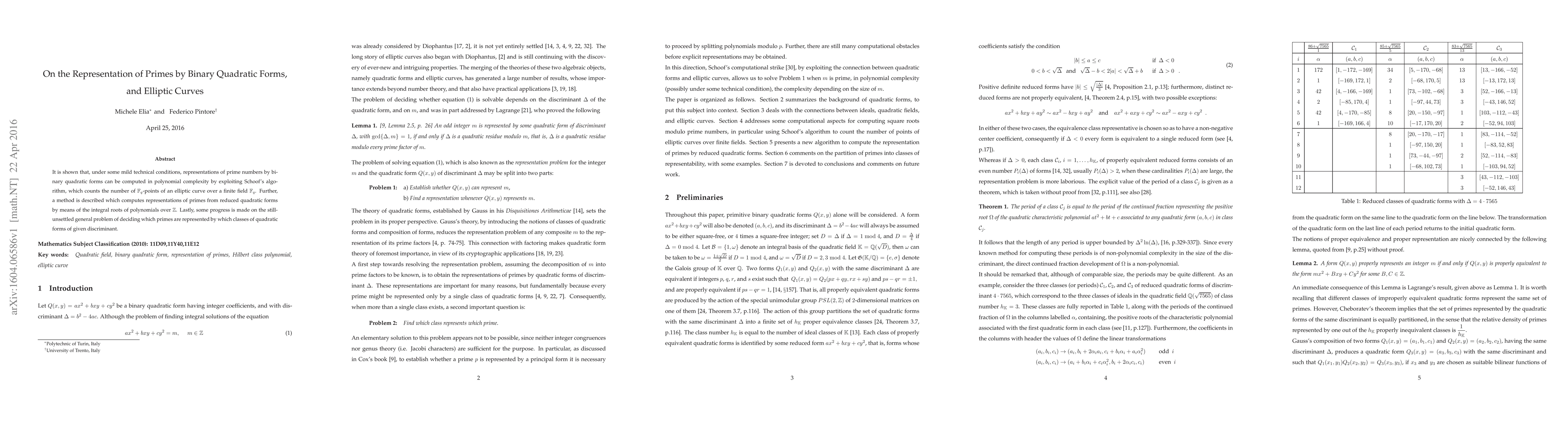 This paper demonstrates that prime numbers can be represented by binary quadratic forms in polynomial time using Schoof's algorithm for elliptic curves over finite fields. It also introduces a method to compute these representations via integral roots of polynomials over the integers.