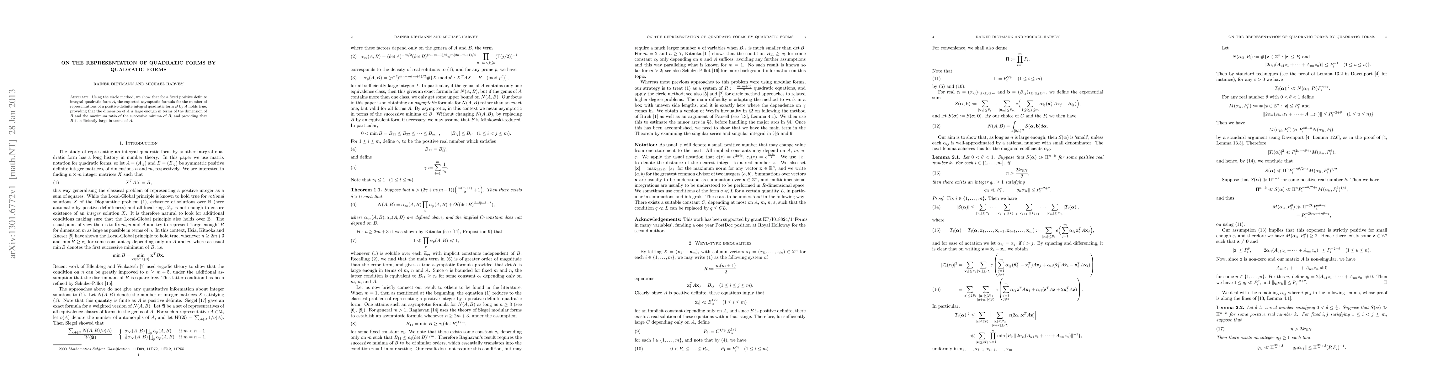 Researchers used the circle method to prove that a large enough quadratic form A can represent many positive definite integral quadratic forms B, as long as B is sufficiently large in terms of A.