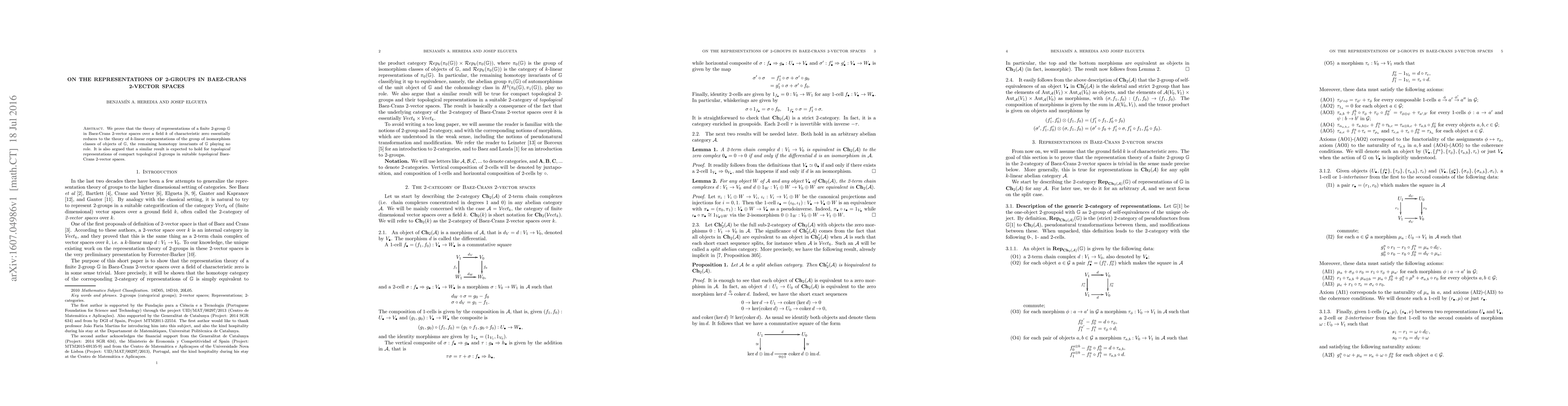 This paper demonstrates that the representation theory of finite 2-groups in Baez-Crans 2-vector spaces over fields of characteristic zero simplifies to $k$-linear representations of the group of object isomorphism classes, with homotopy invariants irrelevant. The authors also conjecture a similar result for topological representations of compact topological 2-groups.