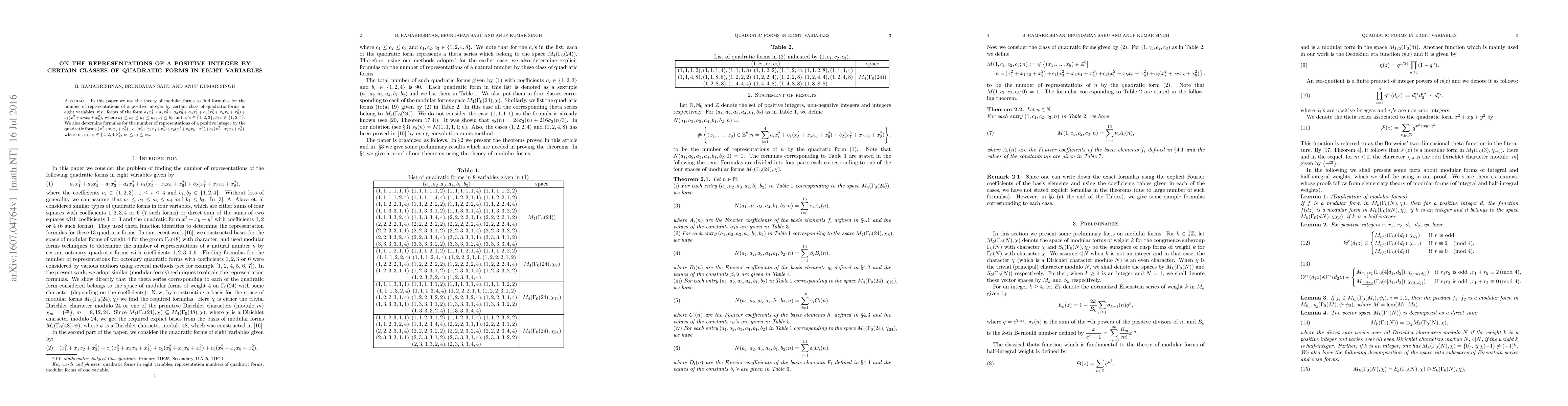 This paper employs modular forms to derive formulas for the number of representations of positive integers by specific quadratic forms in eight variables, focusing on forms with particular constraints on coefficients. It also determines similar formulas for a different class of quadratic forms with varying coefficients.