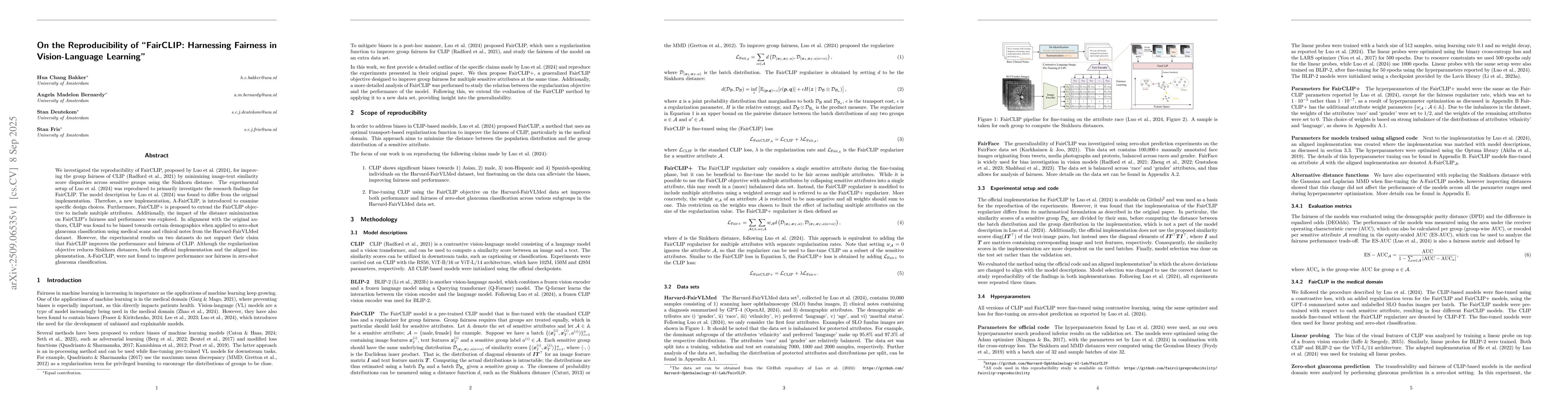 We investigated the reproducibility of FairCLIP, proposed by Luo et al. (2024), for improving the group fairness of CLIP (Radford et al., 2021) by minimizing image-text similarity score disparities across sensitive groups using the Sinkhorn distance. The experimental setup of Luo et al. (2024) was reproduced to primarily investigate the research findings for FairCLIP. The model description by Luo et al. (2024) was found to differ from the original implementation. Therefore, a new implementation, A-FairCLIP, is introduced to examine specific design choices. Furthermore, FairCLIP+ is proposed to extend the FairCLIP objective to include multiple attributes. Additionally, the impact of the distance minimization on FairCLIP's fairness and performance was explored. In alignment with the original authors, CLIP was found to be biased towards certain demographics when applied to zero-shot glaucoma classification using medical scans and clinical notes from the Harvard-FairVLMed dataset. However, the experimental results on two datasets do not support their claim that FairCLIP improves the performance and fairness of CLIP. Although the regularization objective reduces Sinkhorn distances, both the official implementation and the aligned implementation, A-FairCLIP, were not found to improve performance nor fairness in zero-shot glaucoma classification.