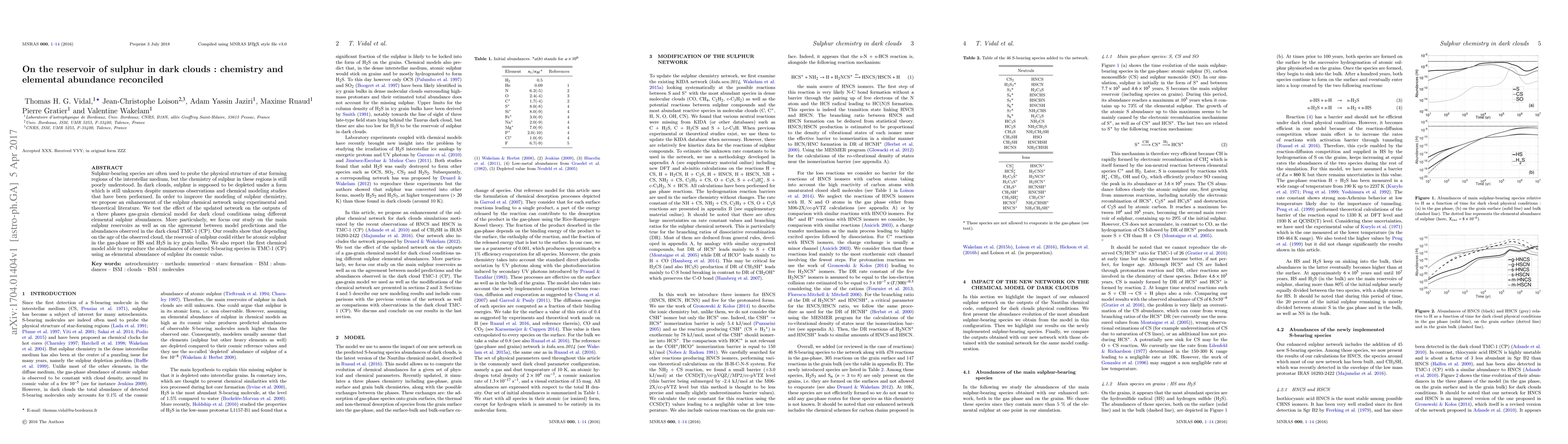 This paper investigates the chemistry and elemental abundance of sulphur in dark clouds, proposing an enhanced chemical network to better model sulphur depletion. The study finds that sulphur reservoirs vary with cloud age, potentially existing as atomic sulphur in the gas phase or as HS and H2S in icy grain bulks, and presents a model that accurately reproduces observed sulphur species abundances in TMC-1 (CP) using cosmic sulphur abundance.