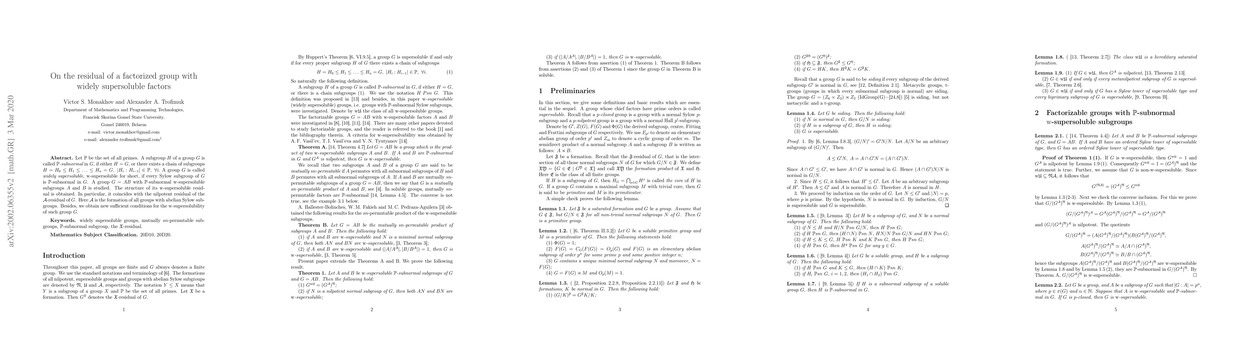 Let $\Bbb P$ be the set of all primes. A subgroup $H$ of a group $G$ is called {\it $\mathbb P$-subnormal} in $G$, if either $H=G$, or there exists a chain of subgroups $H=H_0\le H_1\le \ldots \le H_n=G, \ |H_{i}:H_{i-1}|\in \Bbb P, \ \forall i.$ A group $G$ is called {\it widely supersoluble}, $\mathrm{w}$-supersoluble for short, if every Sylow subgroup of $G$ is $\mathbb P$-subnormal in $G$. A group $G=AB$ with $\mathbb P$-subnormal $\mathrm{w}$-supersoluble subgroups $A$ and $B$ is studied. The structure of its $\mathrm{w}$-supersoluble residual is obtained. In particular, it coincides with the nilpotent residual of the $\mathcal{A}$-residual of $G$. Here $\mathcal{A}$ is the formation of all groups with abelian Sylow subgroups. Besides, we obtain new sufficient conditions for the $\mathrm{w}$-supersolubility of such group $G$.