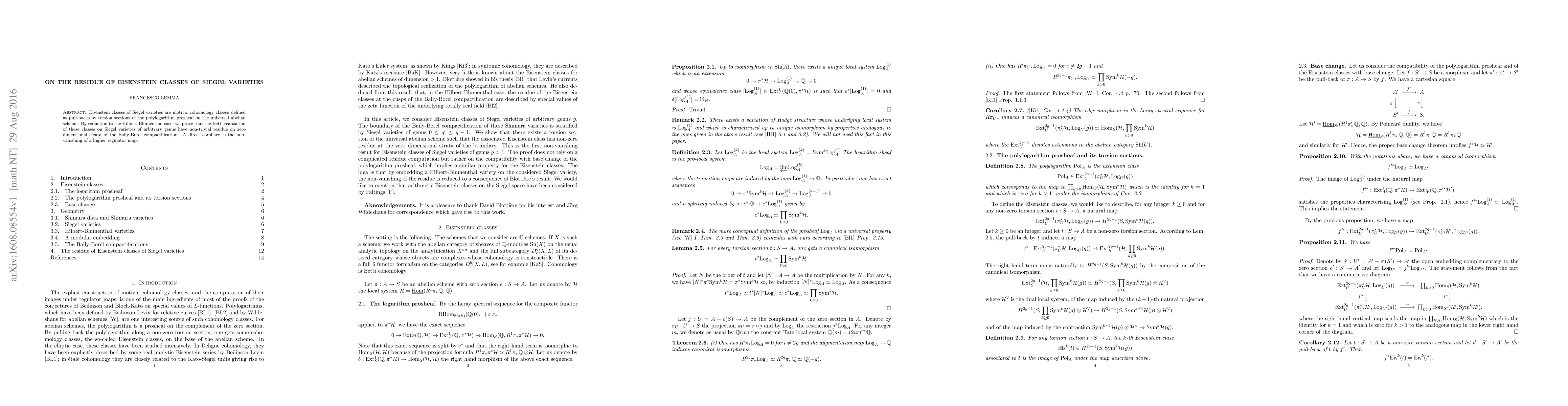 The paper provides a proof of non-trivial residue for Eisenstein classes on Siegel varieties and establishes a modular embedding between Hilbert-Blumenthal and Siegel varieties.