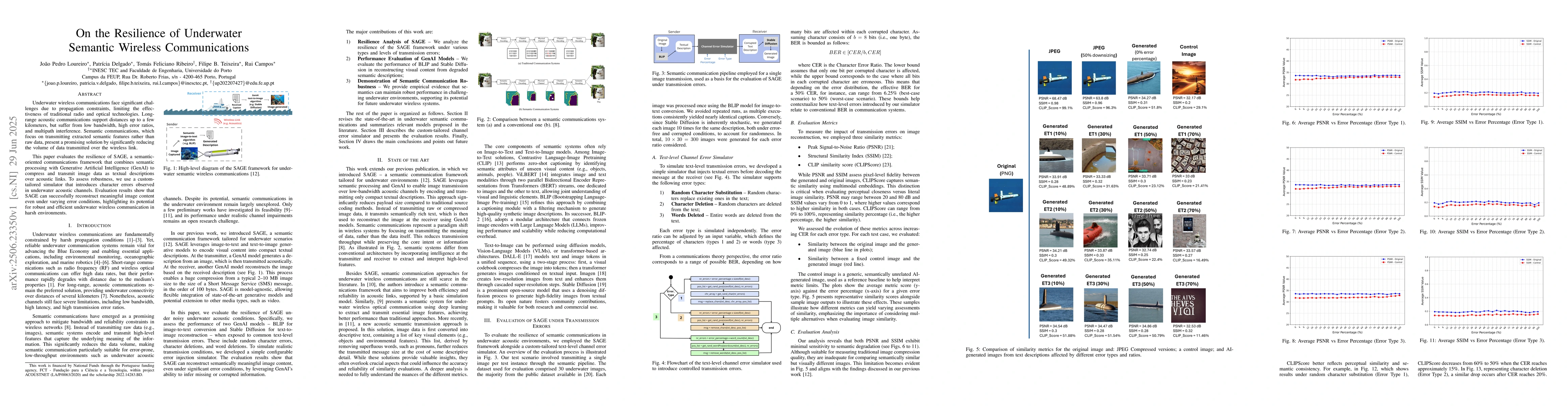 Underwater wireless communications face significant challenges due to propagation constraints, limiting the effectiveness of traditional radio and optical technologies. Long-range acoustic communications support distances up to a few kilometers, but suffer from low bandwidth, high error ratios, and multipath interference. Semantic communications, which focus on transmitting extracted semantic features rather than raw data, present a promising solution by significantly reducing the volume of data transmitted over the wireless link. This paper evaluates the resilience of SAGE, a semantic-oriented communications framework that combines semantic processing with Generative Artificial Intelligence (GenAI) to compress and transmit image data as textual descriptions over acoustic links. To assess robustness, we use a custom-tailored simulator that introduces character errors observed in underwater acoustic channels. Evaluation results show that SAGE can successfully reconstruct meaningful image content even under varying error conditions, highlighting its potential for robust and efficient underwater wireless communication in harsh environments.