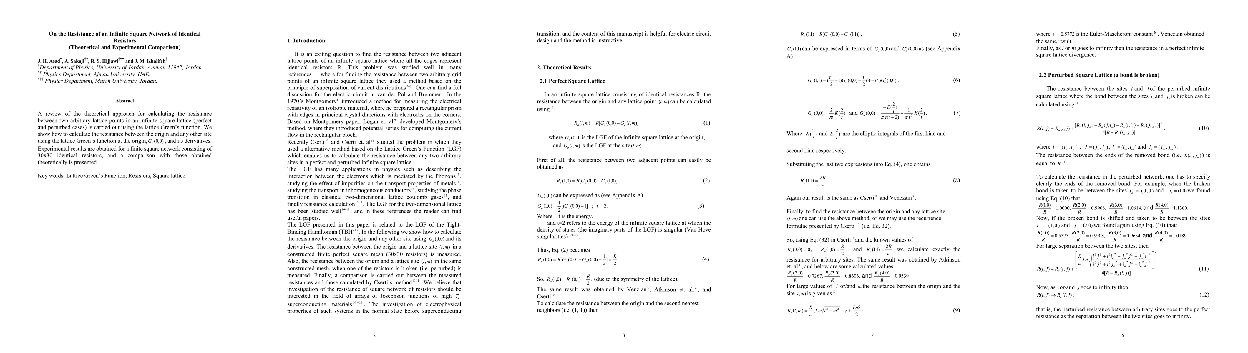 A review of the theoretical approach for calculating the resistance between two arbitrary lattice points in an infinite square lattice (perfect and perturbed cases)is carried out using the Lattice Green's Function. We show how to calculate the resistance between the origin and any other site using the Lattice Green's Function at the origin, and its derivatives. Experimental results are obtained for a finite square network consisting 30x30 identical resistors, and a comparison with those obtained theoretically is presented.