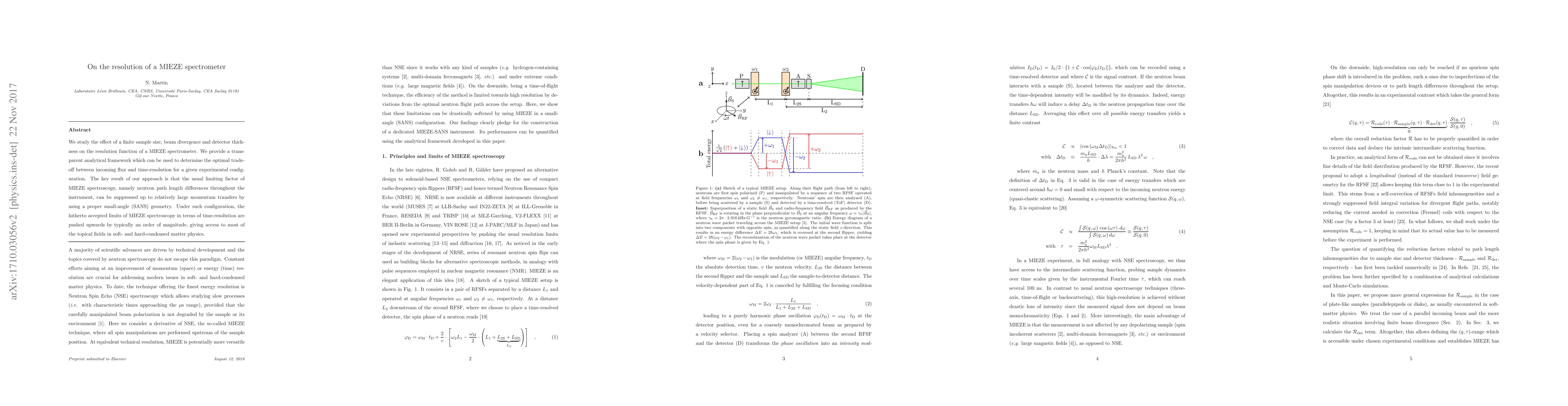 This paper investigates the resolution of a MIEZE spectrometer, analyzing the impact of sample size, beam divergence, and detector thickness. It introduces an analytical framework to optimize the balance between incoming flux and time resolution, demonstrating that neutron path length differences can be significantly reduced using a small-angle geometry, thus enhancing time resolution by an order of magnitude and expanding the spectrometer's applicability to various fields in condensed matter physics.