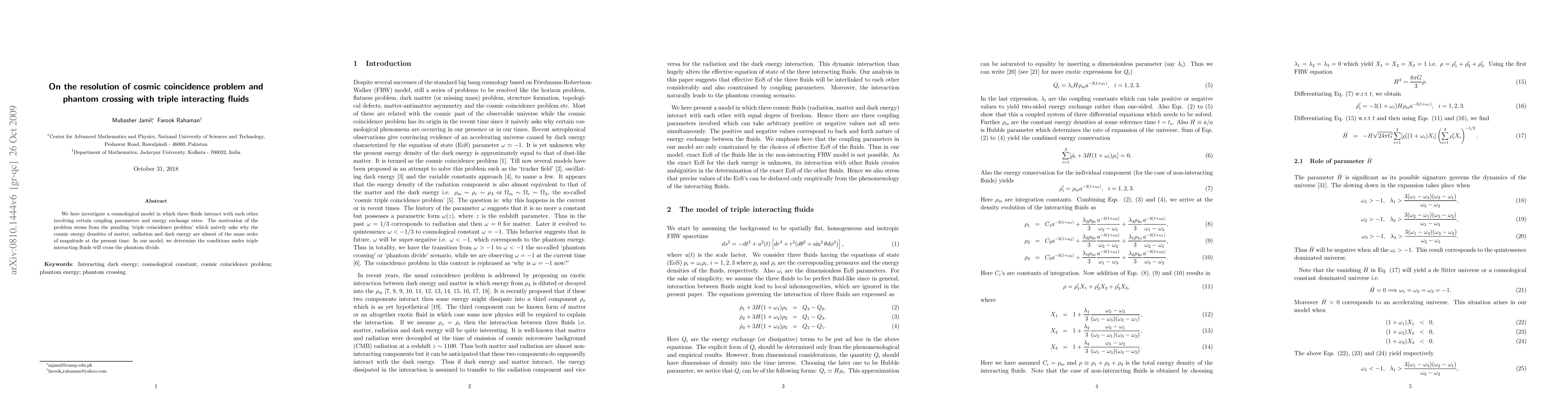 This paper explores a cosmological model with three interacting fluids to resolve the cosmic coincidence problem and examines conditions under which these fluids might cross the phantom divide, addressing why their energy densities are comparable today.