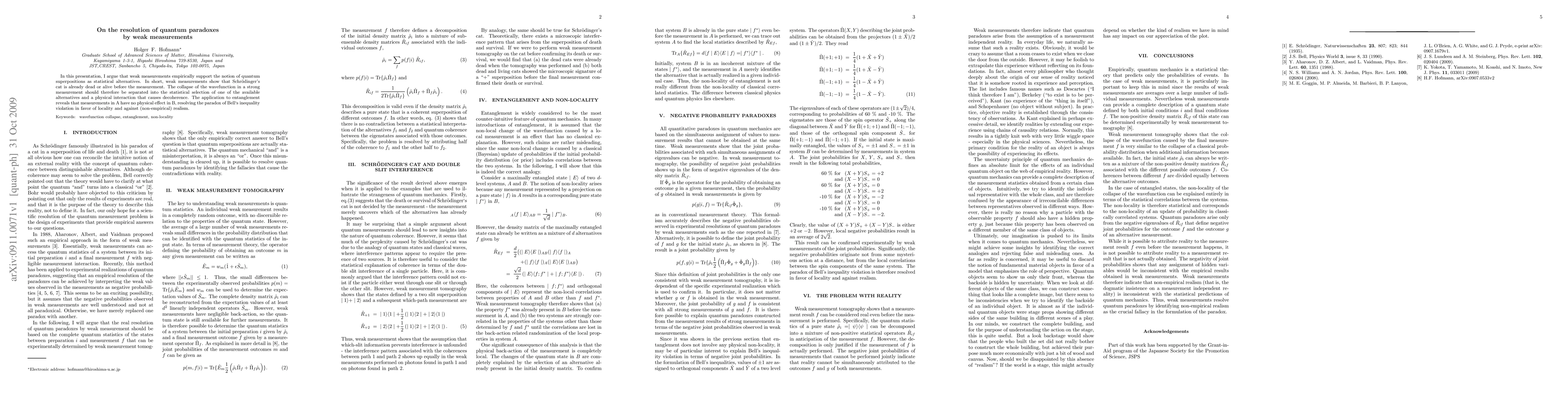 In this presentation, I argue that weak measurements empirically support the notion of quantum superpositions as statistical alternatives. In short, weak measurements show that Schroedinger's cat is already dead or alive before the measurement. The collapse of the wavefunction in a strong measurement should therefore be separated into the statistical selection of one of the available alternatives and a physical interaction that causes decoherence. The application to entanglement reveals that measurements in A have no physical effect in B, resolving the paradox of Bell`s inequality violation in favor of locality and against (non-empirical) realism.