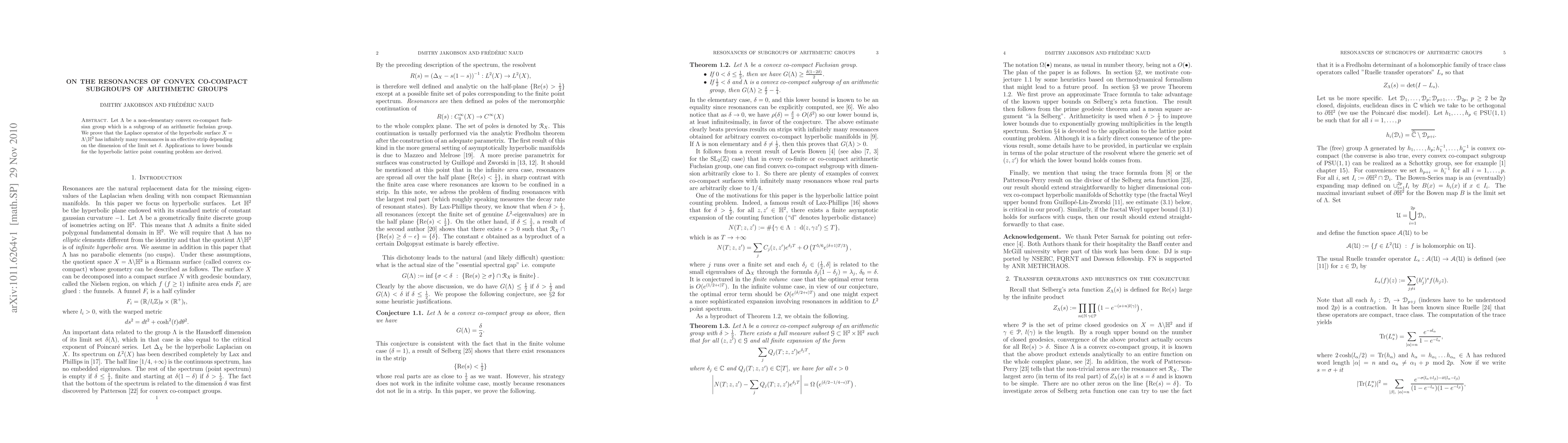 This paper proves the existence of infinitely many resonances in the Laplace operator for the hyperbolic surface associated with a non-elementary convex co-compact Fuchsian subgroup of an arithmetic Fuchsian group, with implications for lower bounds in the hyperbolic lattice point counting problem.