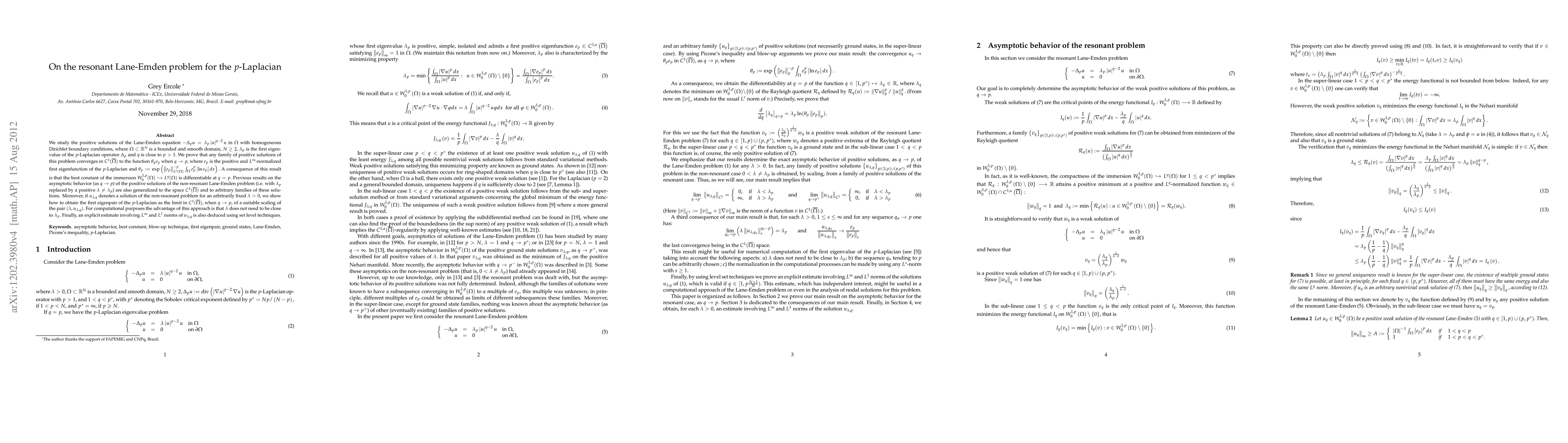 We study the positive solutions of the Lane-Emden equation $-\Delta_{p}u=\lambda_{p}|u|^{q-2}u$ in $\Omega$ with homogeneous Dirichlet boundary conditions, where $\Omega\subset\mathbb{R}^{N}$ is a bounded and smooth domain, $N\geq2,$ $\lambda_{p}$ is the first eigenvalue of the $p$-Laplacian operator $\Delta_{p}$ and $q$ is close to $p>1.$ We prove that any family of positive solutions of this problem converges in $C^{1}(\bar{\Omega})$ to the function $\theta_{p}e_{p}$ when $q\rightarrow p,$ where $e_{p}$ is the positive and $L^{\infty}$-normalized first eigenfunction of the $p$-Laplacian and $\theta_{p}:=\exp(|e_{p}|_{L^{p}(\Omega)}^{-p}\int_{\Omega}e_{p}% ^{p}|\ln e_{p}|dx).$ A consequence of this result is that the best constant of the immersion $W_{0}^{1,p}(\Omega)\hookrightarrow L^{q}(\Omega)$ is differentiable at $q=p.$ Previous results on the asymptotic behavior (as $q\rightarrow p$) of the positive solutions of the non-resonant Lane-Emden problem (i.e. with $\lambda_{p}$ replaced by a positive $\lambda\neq\lambda_{p}$) are also generalized to the space $C^{1}% (\bar{\Omega})$ and to arbitrary families of these solutions. Moreover, if $u_{\lambda,q}$ denotes a solution of the non-resonant problem for an arbitrarily fixed $\lambda>0,$ we show how to obtain the first eigenpair of the $p$-Laplacian as the limit in $C^{1}(\bar{\Omega}),$ when $q\rightarrow p$, of a suitable scaling of the pair $(\lambda,u_{\lambda,q}).$ For computational purposes the advantage of this approach is that $\lambda$ does not need to be close to $\lambda_{p}.$ Finally, an explicit estimate involving $L^{\infty}$ and $L^{1}$ norms of $u_{\lambda,q}$ is also deduced using set level techniques.