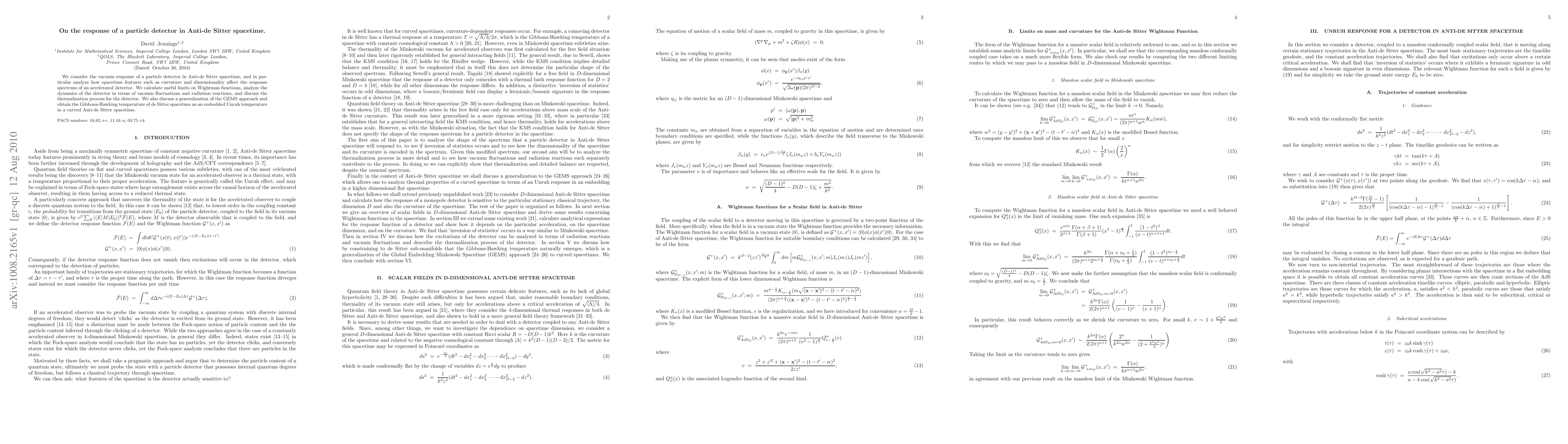 This paper investigates the vacuum response of a particle detector in Anti-de Sitter (AdS) spacetime, focusing on how curvature and dimensionality influence the detector's spectrum. It also generalizes the GEMS approach and connects the Gibbons-Hawking temperature of de Sitter spacetime to the Unruh temperature in curved AdS.