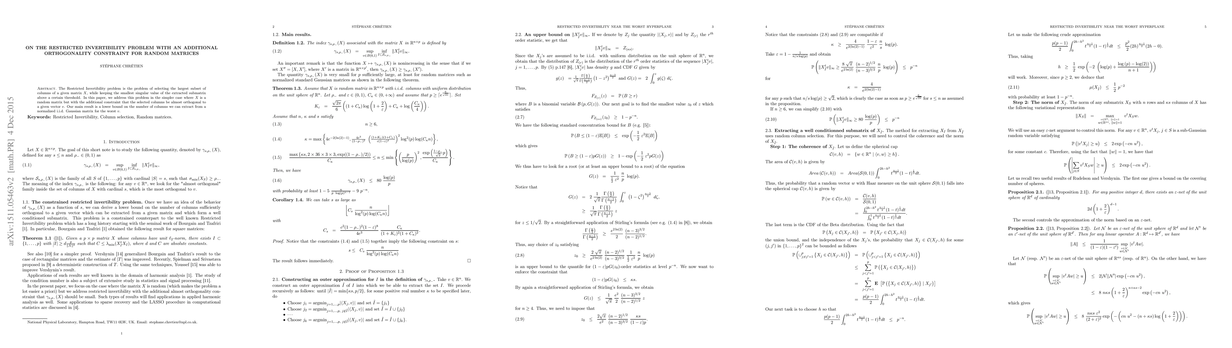 The Restricted Invertibility problem is the problem of selecting the largest subset of columns of a given matrix $X$, while keeping the smallest singular value of the extracted submatrix above a certain threshold. In this paper, we address this problem in the simpler case where $X$ is a random matrix but with the additional constraint that the selected columns be almost orthogonal to a given vector $v$. Our main result is a lower bound on the number of columns we can extract from a normalized i.i.d. Gaussian matrix for the worst $v$.