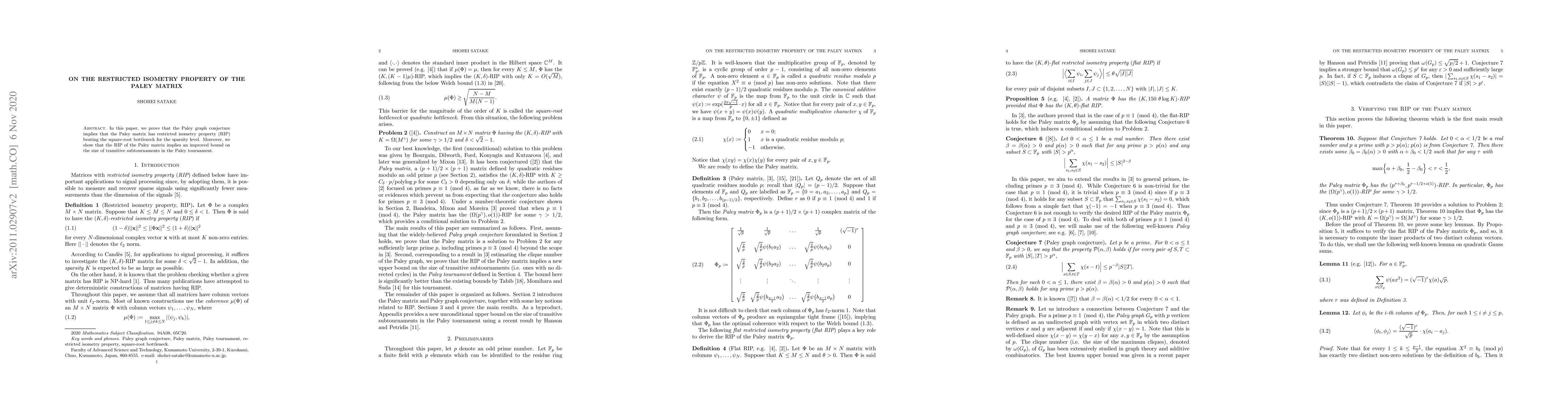 This paper proves that the Paley graph conjecture leads to the Paley matrix having a restricted isometry property (RIP) that surpasses the square-root sparsity level bottleneck. Additionally, it demonstrates that the Paley matrix's RIP results in a better bound on the size of transitive subtournaments in the Paley tournament.