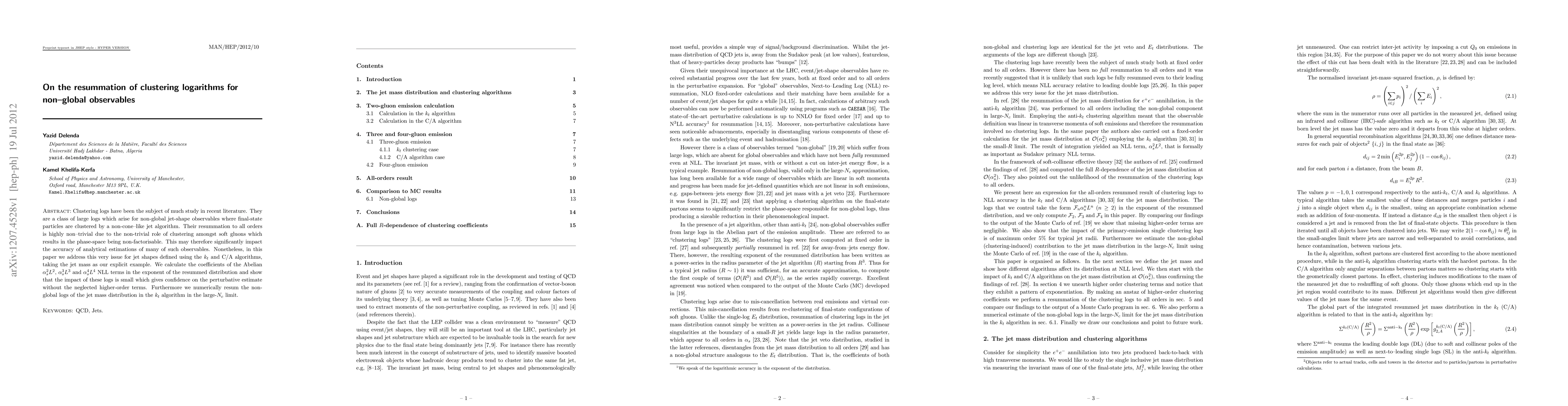 Researchers studied the resummation of clustering logarithms for non-global observables in particle physics, finding that their impact is small and can be neglected without affecting perturbative estimates. This allows for more accurate calculations of certain jet shapes.