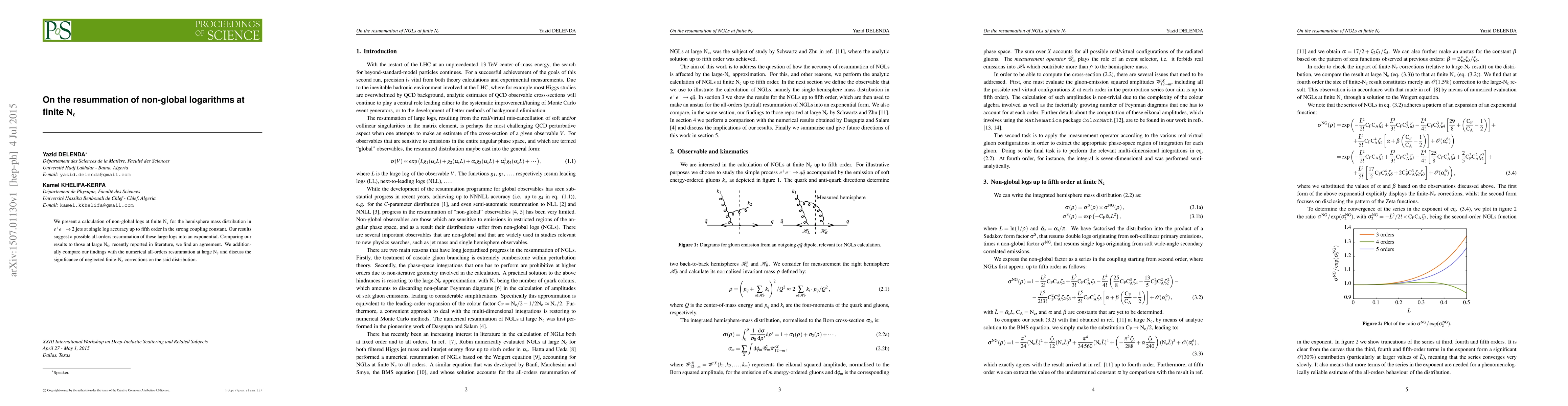 This paper calculates non-global logarithms at finite $\mathrm{N_c}$ for the hemisphere mass distribution in $e^+e^-\to 2$ jets, achieving single log accuracy up to fifth order in the strong coupling constant. The results suggest an all-orders resummation of these large logs into an exponential, showing agreement with large $\mathrm{N_c}$ findings and discussing the impact of finite-$\mathrm{N_c}$ corrections.