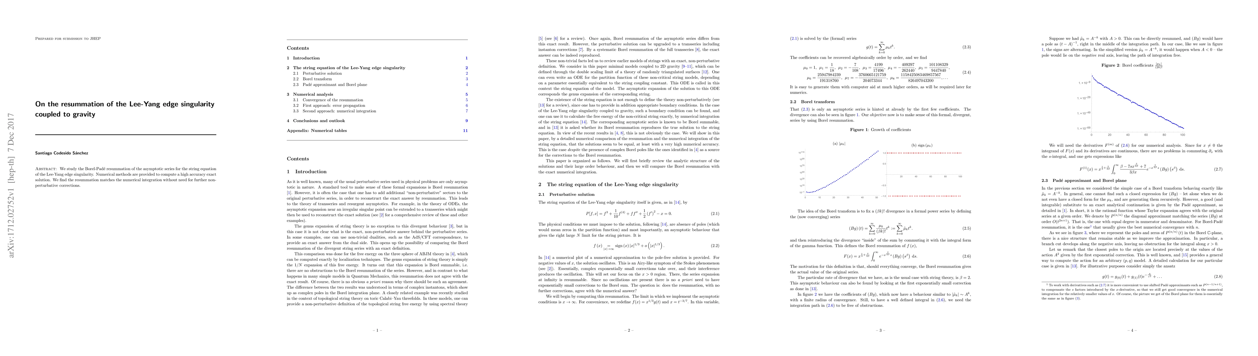 This paper investigates the resummation of the Lee-Yang edge singularity in string theory, employing Borel-Padé techniques. The authors achieve high-accuracy solutions through numerical methods, confirming that the resummation aligns perfectly with numerical integration without requiring additional non-perturbative corrections.