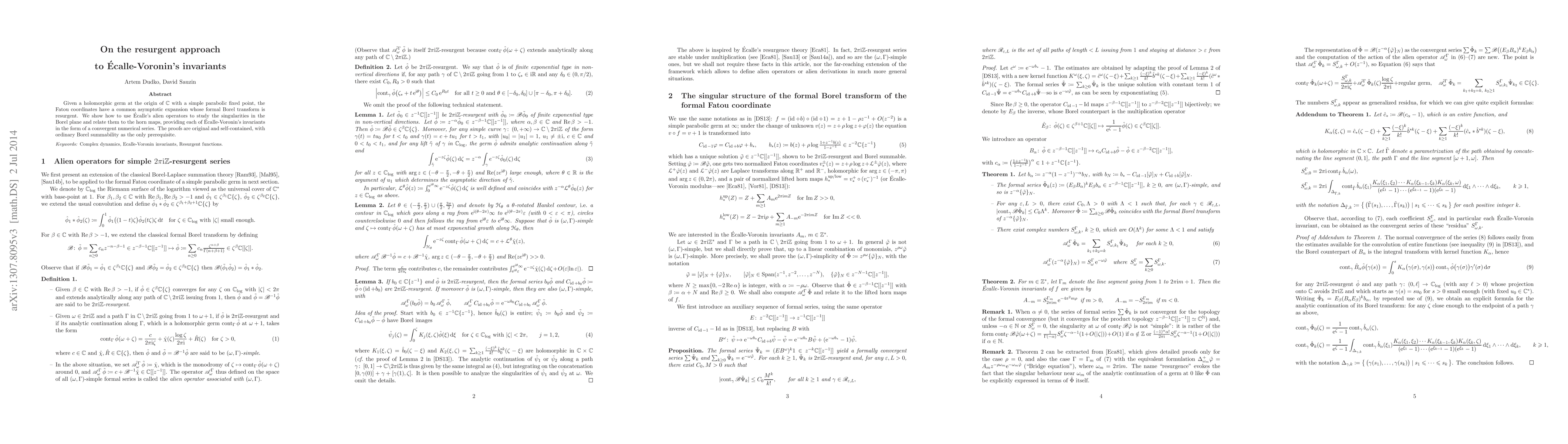 Given a holomorphic germ at the origin of C with a simple parabolic fixed point, the Fatou coordinates have a common asymptotic expansion whose formal Borel transform is resurgent. We show how to use Ecalle's alien operators to study the singularities in the Borel plane and relate them to the horn maps, providing each of Ecalle-Voronin's invariants in the form of a convergent numerical series. The proofs are original and self-contained, with ordinary Borel summability as the only prerequisite.