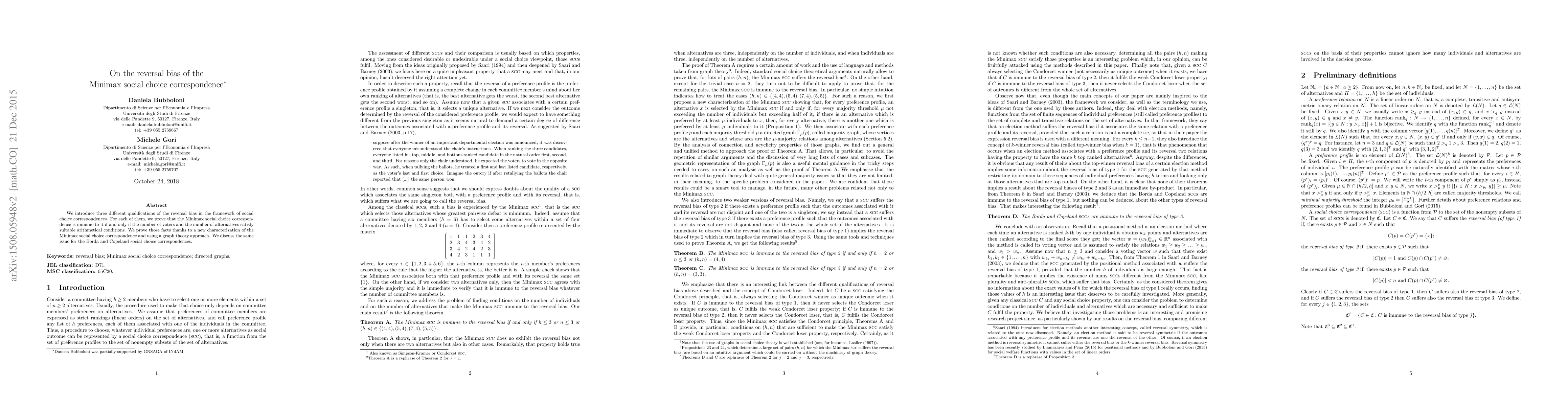We introduce three different qualifications of the reversal bias in the framework of social choice correspondences. For each of them, we prove that the Minimax social choice correspondence is immune to it if and only if the number of voters and the number of alternatives satisfy suitable arithmetical conditions. We prove those facts thanks to a new characterization of the Minimax social choice correspondence and using a graph theory approach. We discuss the same issue for the Borda and Copeland social choice correspondences.