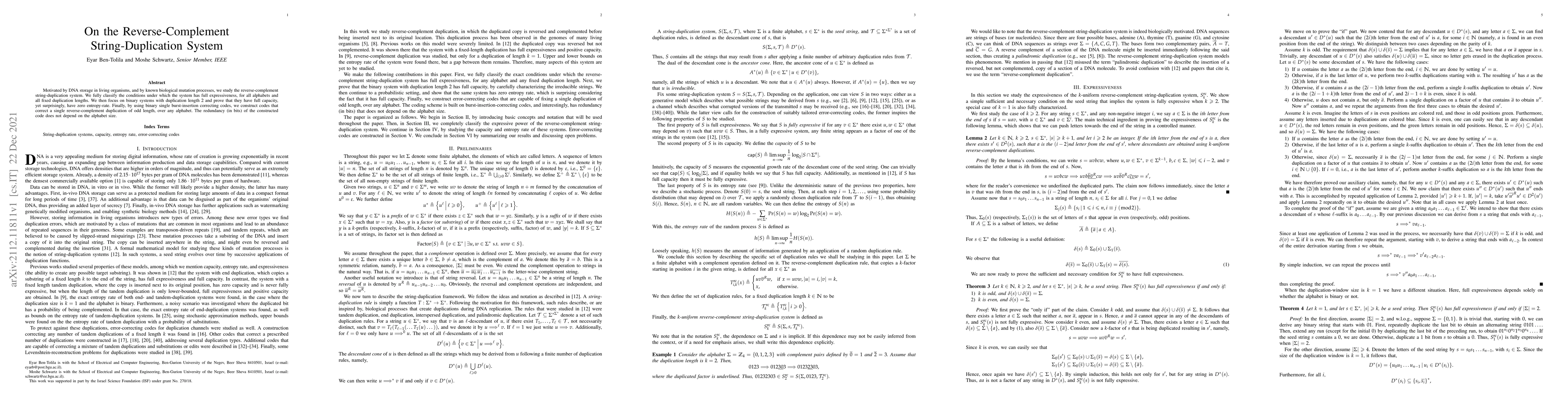 This paper classifies the conditions for full expressiveness in reverse-complement string-duplication systems, revealing that binary systems with duplication length 2 have full capacity but zero entropy-rate. It also constructs codes correcting single reverse-complement duplications of odd length, independent of the alphabet size.