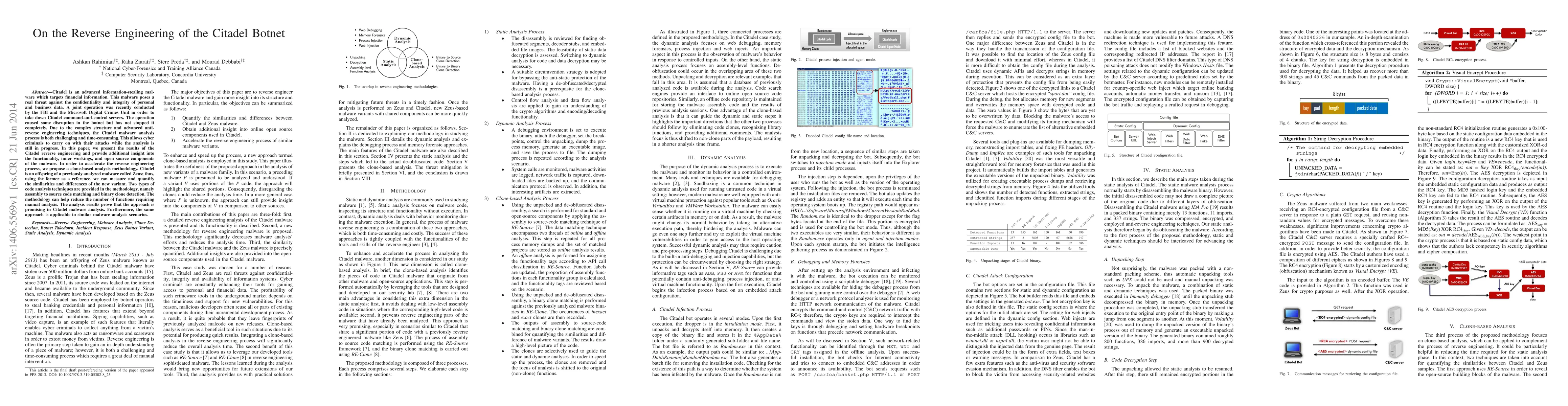 This research analyzes the Citadel malware, a sophisticated banking trojan, by developing a clone-based method to speed up reverse engineering and identify its features. The approach leverages similarities with previous malware, making analysis more efficient and applicable to other threats.