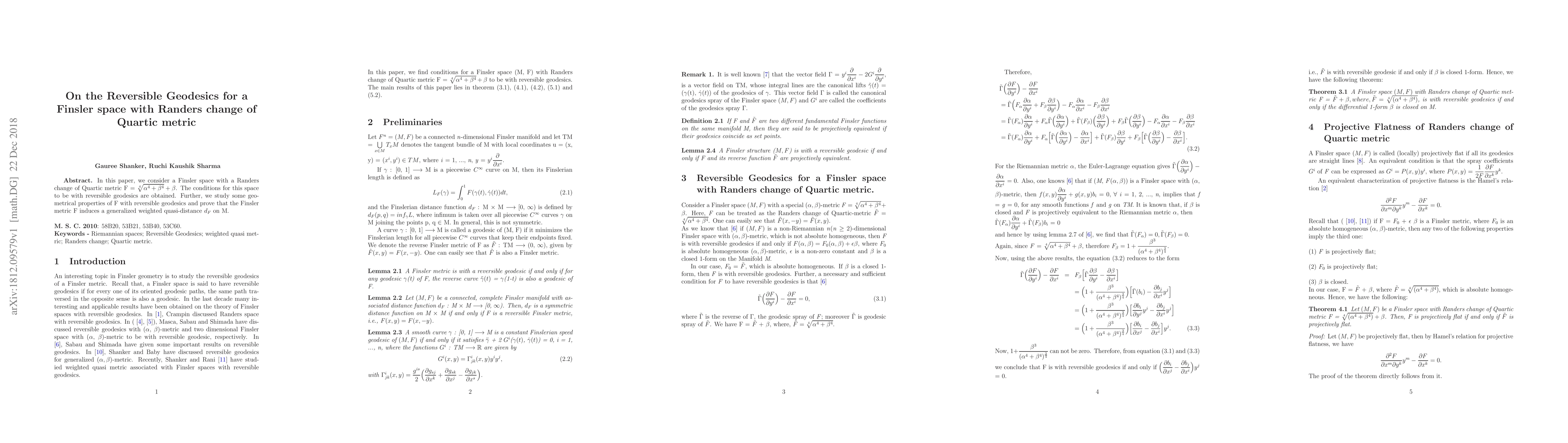 In this paper, we consider a Finsler space with a Randers change of Quartic metric F = $\sqrt[4]{\alpha^4 + \beta^4} + \beta$. The conditions for this space to be with reversible geodesics are obtained. Further, we study some geometrical properties of F with reversible geodesics and prove that the Finsler metric F induces a generalized weighted quasi-distance $d_F$ on M.