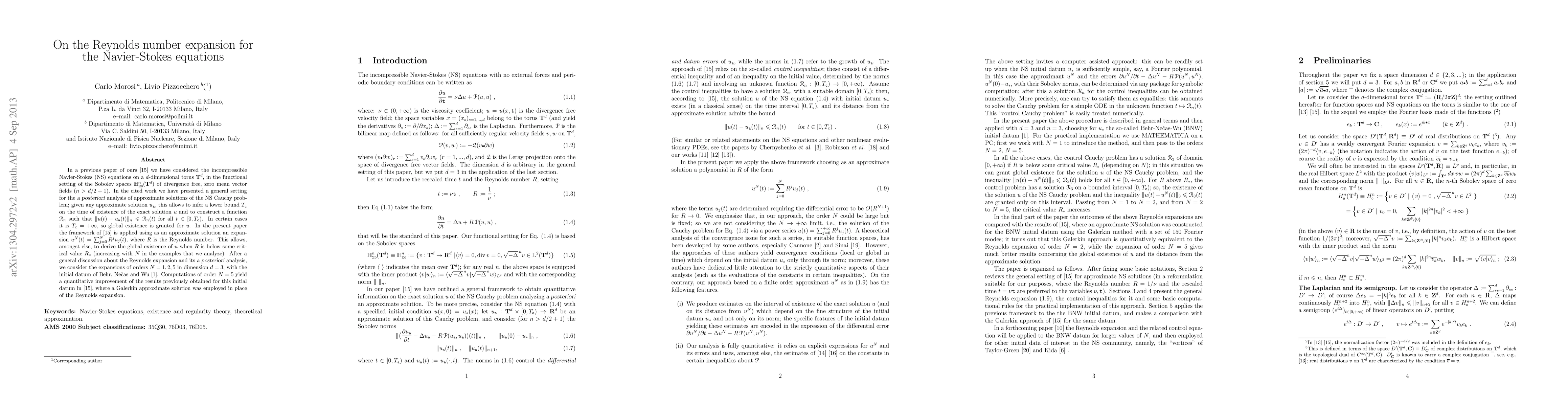 This paper extends the analysis of approximate solutions to the incompressible Navier-Stokes equations using a Reynolds number expansion, deriving global existence conditions for the exact solution when the Reynolds number is below a critical value. It also quantitatively improves previous results using higher-order expansions in three dimensions.