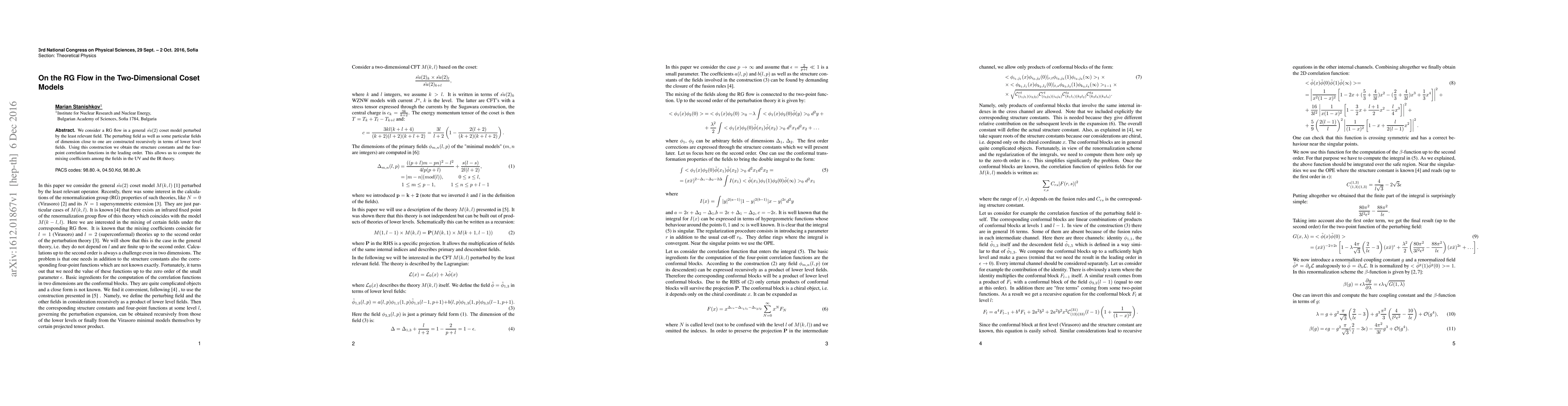 Researchers studied a specific type of theoretical physics model called a coset model, focusing on how it changes under a process called renormalization group flow. They used this to calculate important properties like field interactions and mixing coefficients.