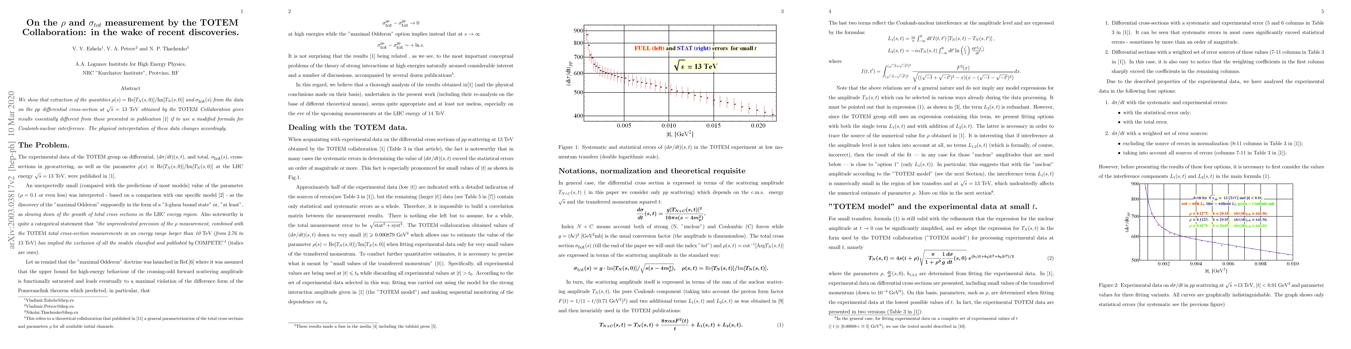 We show that extraction of the quantities} $\rho(s)=\mbox{Re}[T_{N}(s,0)]/\mbox{Im}[T_{N}(s,0)]$ {\it and} $\sigma_{\mbox{tot}}(s)$ {\it from the data on the $pp$ differential cross-section at $\sqrt{s} = 13$} TeV {\it obtained by the} TOTEM {\it Collaboration gives results essentially different from those presented in publication} \cite{Ant} {\it if to use a modified formula for Coulomb-nuclear interference. The physical interpretation of these data changes accordingly.