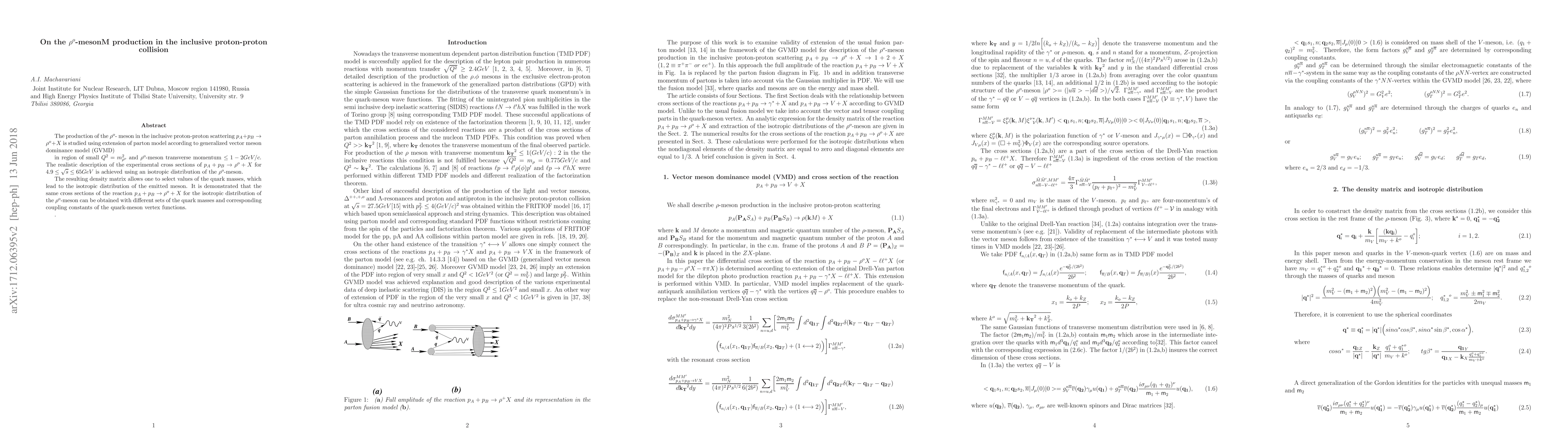 The production of the $\rho^o$- meson in the inclusive proton-proton scattering $p_A+p_B\to \rho^o+X$ is studied using extension of parton model according to generalized vector meson dominance model (GVMD) in region of small $Q^2=m_{\rho^o}^2$ and $\rho^o$-meson transverse momentum $\le 1-2GeV/c$. The realistic description of the experimental cross sections of $p_A+p_B\to \rho^o+X$ for $4.9\le \sqrt{s}\le 65 GeV$ is achieved using an isotropic distribution of the $\rho^o$-meson. The resulting density matrix allows one to select values of the quark masses, which lead to the isotropic distribution of the emitted meson. It is demonstrated that the same cross sections of the reaction $p_A+p_B\to\rho^o +X$ for the isotropic distribution of the $\rho^o$-meson can be obtained with different sets of the quark masses and corresponding coupling constants of the quark-meson vertex functions.