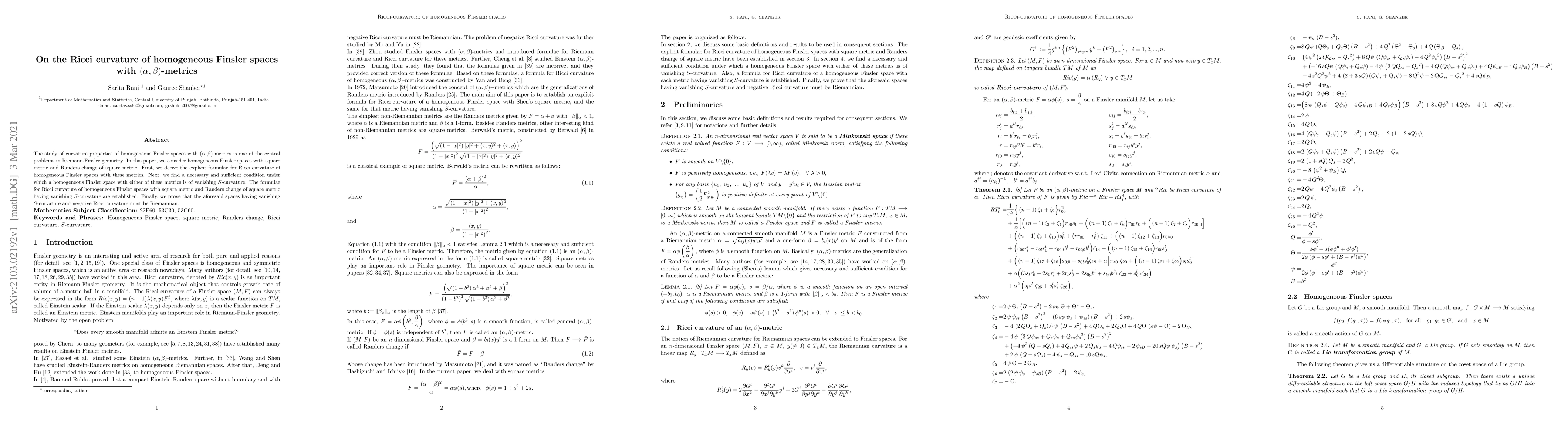 This paper derives explicit Ricci curvature formulae for homogeneous Finsler spaces with square and Randers metrics, establishing a condition for vanishing $S$-curvature and proving that such spaces with negative Ricci curvature must be Riemannian.