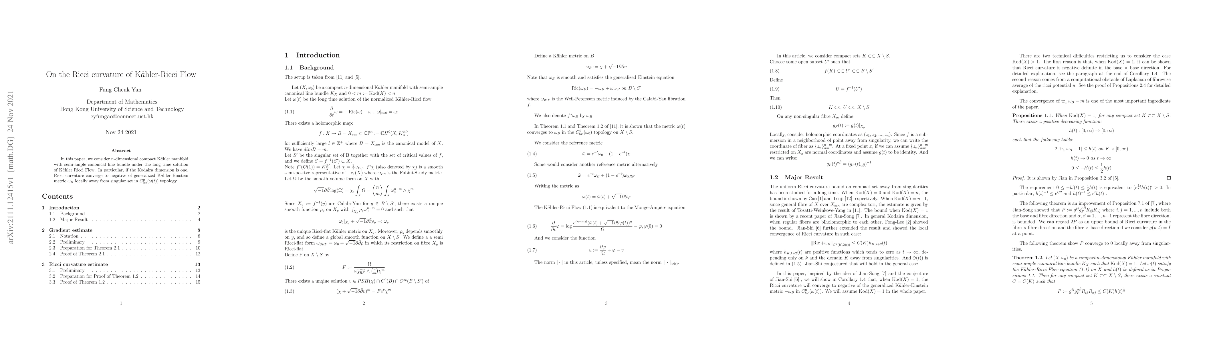In this paper, we consider $n$-dimensional compact K$\ddot{a}$hler manifold with semi-ample canonical line bundle under the long time solution of K$\ddot{a}$hler Ricci Flow. In particular, if the Kodaira dimension is one, Ricci curvature converge to negative of generalized K$\ddot{a}$hler Einstein metric $\omega_B$ locally away from singular set in $C^0_{loc}(\omega(t))$ topology.