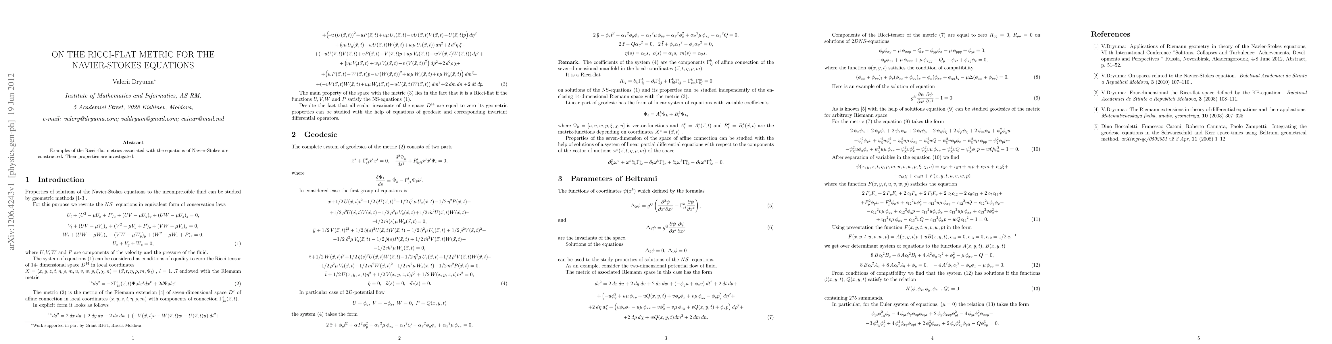 An examples of the Ricci-flat metric associated with the equations of Navier-Stokes are constructed. Their properties are investigated.