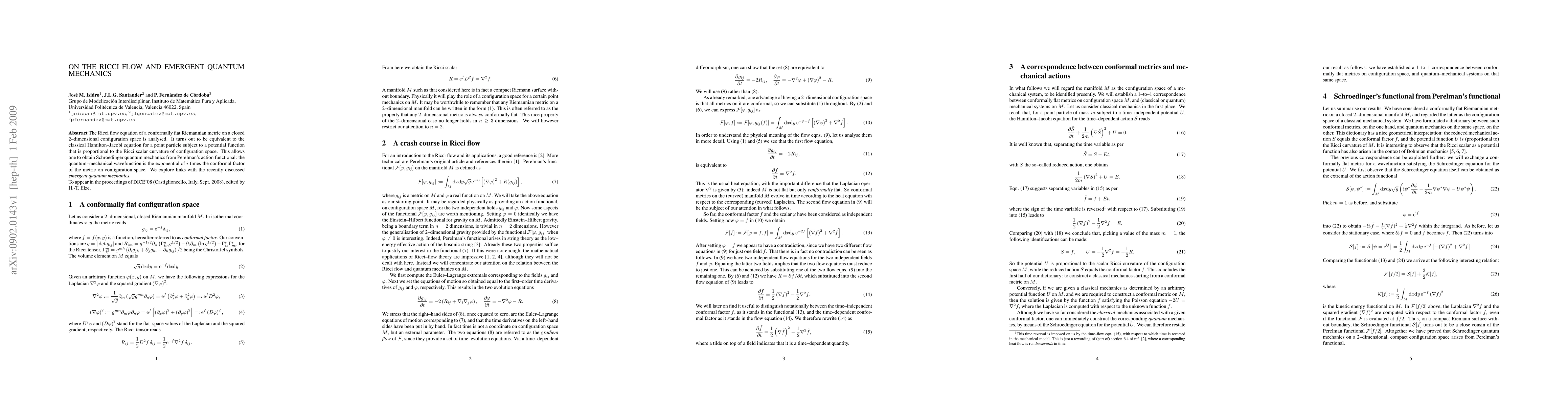 The Ricci flow equation of a conformally flat Riemannian metric on a closed 2-dimensional configuration space is analysed. It turns out to be equivalent to the classical Hamilton-Jacobi equation for a point particle subject to a potential function that is proportional to the Ricci scalar curvature of configuration space. This allows one to obtain Schroedinger quantum mechanics from Perelman's action functional: the quantum-mechanical wavefunction is the exponential of $i$ times the conformal factor of the metric on configuration space. We explore links with the recently discussed emergent quantum mechanics.