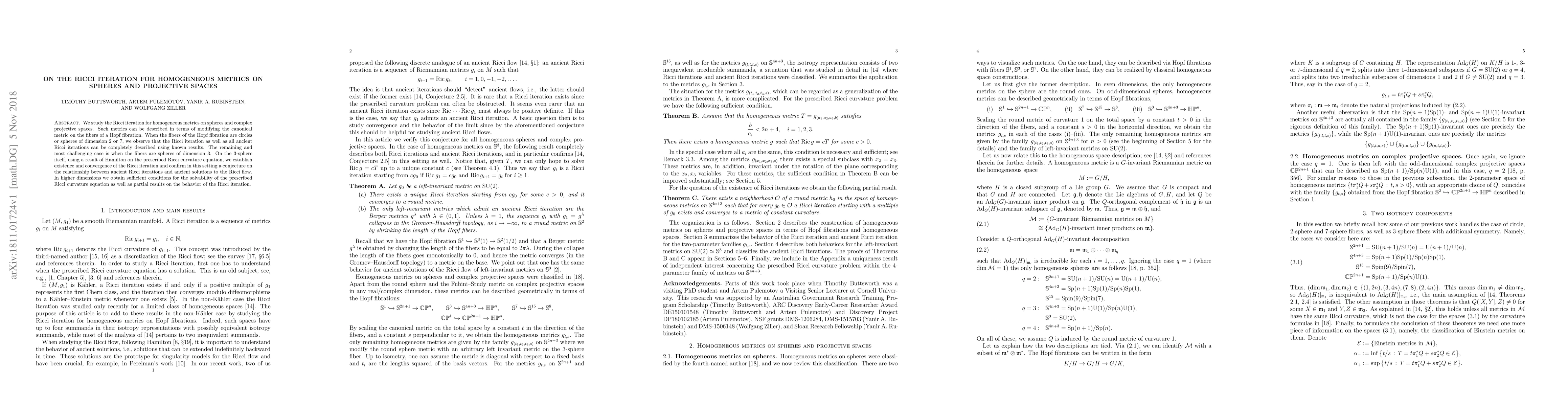 This paper explores the Ricci iteration for homogeneous metrics on spheres and complex projective spaces, particularly focusing on the challenging case when fibers are 3-dimensional spheres. It establishes existence and convergence of the Ricci iteration on the 3-sphere using Hamilton's results, and provides conditions for solvability of the prescribed Ricci curvature equation in higher dimensions.