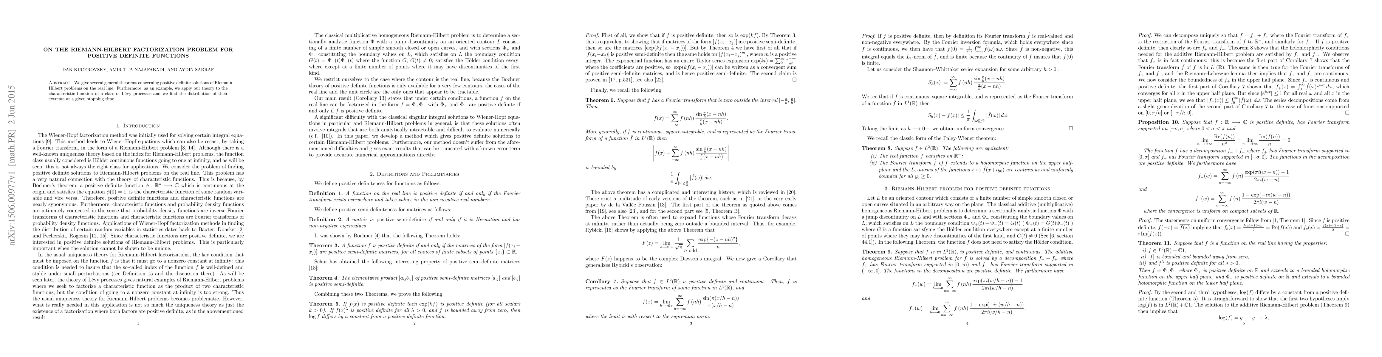 Summary: The paper presents theorems for positive definite solutions of Riemann-Hilbert problems on the real line and applies these to determine the distribution of extrema of Lévy processes' characteristic functions at specified stopping times.